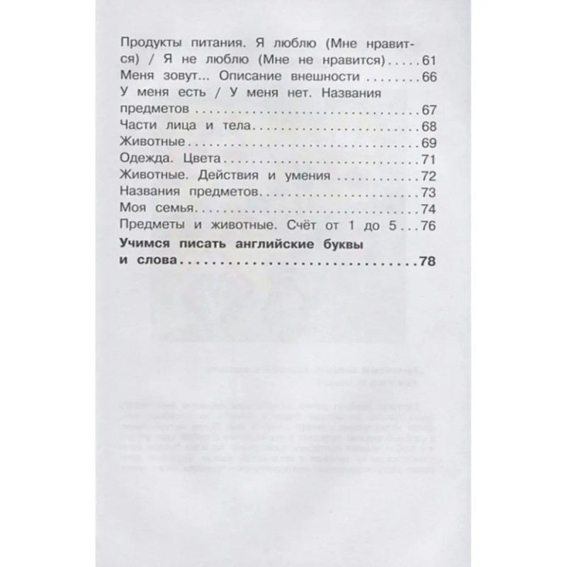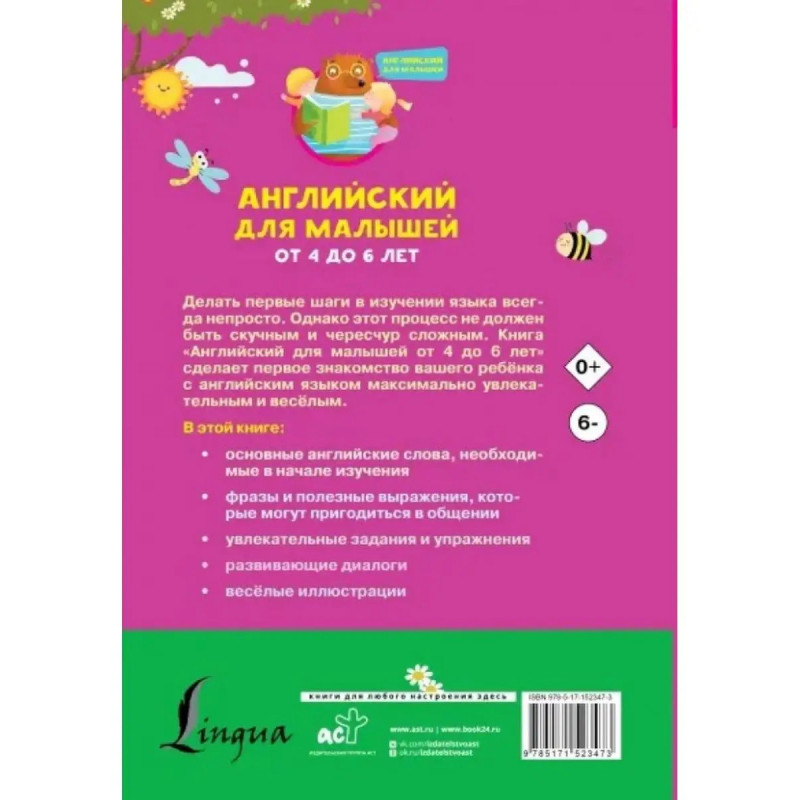 Английский для малышей от 4 до 6 лет. Державина В. А. Данное издание содержит всю необходимую базовую информацию, которая поможет вашему ребенку сделать первые уверенные шаги на пути изучения английского языка. Оно включает 40 уроков-занятий (с советами и рекомендациями), раздел с творческими заданиями на повторение и закрепление пройденного, а также прописи английских букв. Пособие предназначено для занятий английским языком с детьми в возрасте от 4 до 6 лет и может использоваться как в детских дошкольных учебных заведениях, так и для самостоятельных занятий с детьми в домашней обстановке.