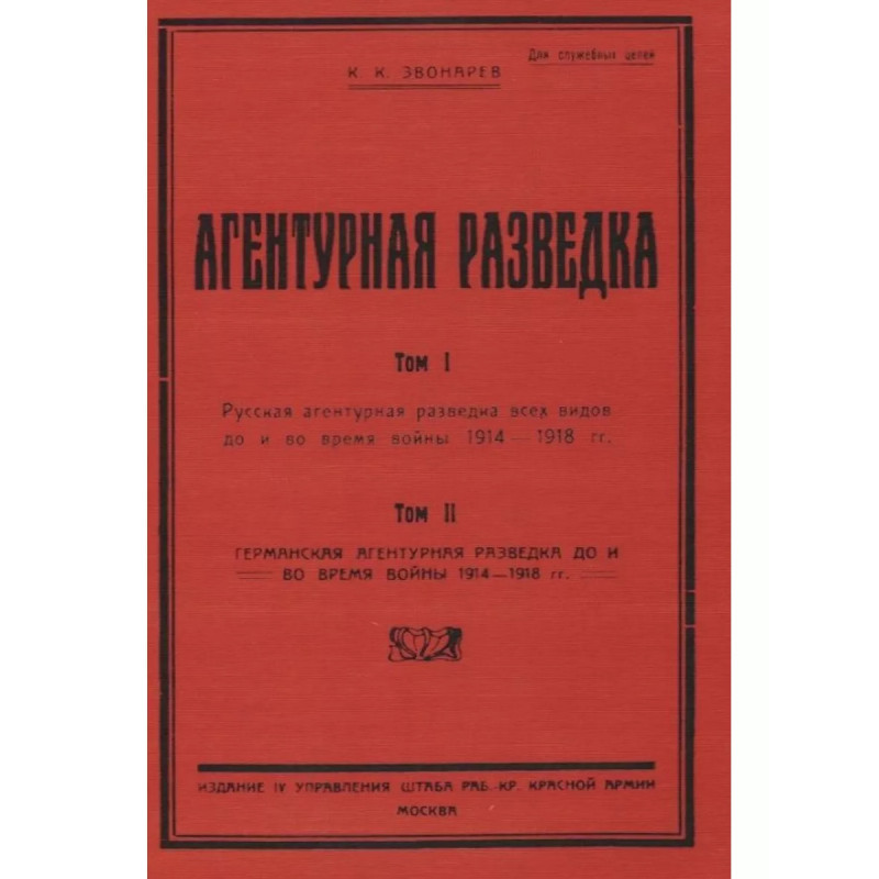Агентурная разведка. I. Русская агентурная разведка всех видов до и во время войны 1914-1918 гг.; II. Германская агентурная разведка до и во время войны 1914-1918 гг. Звонарев К.К. В начале 1920-х годов перед специалистами IV (разведывательного) управления Штаба РККА была поставлена задача "провести обширное исследование, охватывающее деятельность агентуры всех важнейших государств, принимавших участие в мировой войне". Результатом реализации столь глобального замысла стали подготовленные тома капитального исследования: том I - об агентурной разведке царской России и том II - об агентурной разведке Германии, которые вышли из печати в 1929-31 гг. под грифом "Для служебных целей". Звонарев Константин Кириллович (настоящее имя: Карл Кришьянович Звайгзне). 1892-1938. Латыш. Из крестьян. Полковник (с 1936). В РККА с 1918. Член компартии с 1908. Участник Гражданской войны (1918-1920). "На территории, занятой австро-германскими оккупантами" (Житомир, Новгород-Волынск), выполнял "специальные задания" председателя ревкома Юго-Западного фронта". Помощник военного атташе при полпредстве РСФСР в Литве (1921), военный атташе при полпредстве РСФСР в Турции (1921-1923). Начальник 2-го отделения и помощник начальника Агентурной части РО штаба РККА (1923-1924), 1-й помощник начальника РУ штаба РККА (1924-1926) и одновременно начальник 2-го (агентурного) отдела Управления. Преподаватель (1933-1934), начальник кафедры разведки, старший преподаватель разведки (1934-1937).