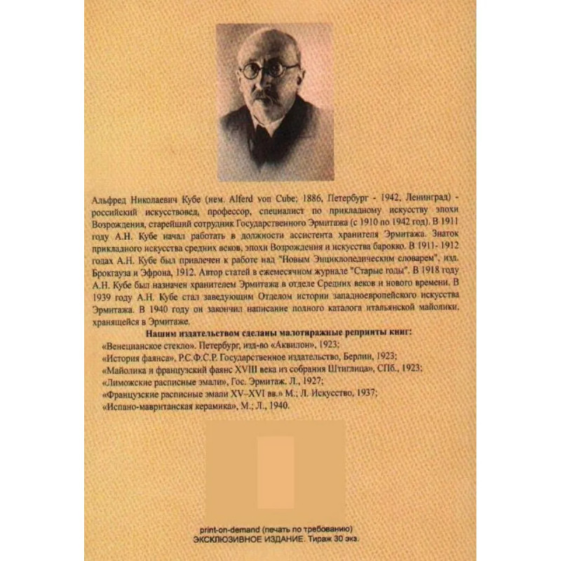 Венецианское стекло. Кубе А.Н. Репринт с издания. Петербург, изд-во "Аквилон", 1923. 12 илл. на отдельных листах и много илл. в тексте.Альфред Николаевич Кубе (1886 - 1942) - российский искусствовед, профессор, специалист по прикладному искусству эпохи Возрождения, старейший сотрудник Государственного Эрмитажа (с 1910 по 1942 год). В 1911 году А.Н. Кубе начал работать в должности ассистента хранителя Эрмитажа. Знаток прикладного искусства средних веков, эпохи Возрождения и искусства барокко. В 1918 году А.Н. Кубе был назначен хранителем Эрмитажа в отделе Cредних веков и нового времени. В 1939 году А.Н. Кубе стал заведующим Отделом истории западноевропейского искусства Эрмитажа. В 1940 году он закончил написание полного каталога итальянской майолики, хранящейся в Эрмитаже. Нашим издательством сделаны малотиражные репринты его книг: "Венецианское стекло". 1923; "История фаянса", 1923; "Майолика и французский фаянс XVIII века из собрания Штиглица", 1923; "Лиможские расписные эмали", 1927; "Французские расписные эмали XV-XVI вв." 1937; "Испано-мавританская керамика", 1940; Испано-мавританские фаянсы 1914.