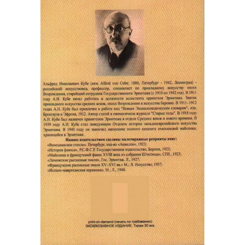 Испано-мавританская керамика. Кубе А.Н. Репринт с издания. М. ; Л., 1940. 57 илл.Альфред Николаевич Кубе (1886 1942) российский искусствовед, профессор, специалист по прикладному искусству эпохи Возрождения, старейший сотрудник Государственного Эрмитажа (с 1910 по 1942 год). В 1911 году А. Н. Кубе начал работать в должности ассистента хранителя Эрмитажа. Знаток прикладного искусства средних веков, эпохи Возрождения и искусства барокко. В 1918 году А. Н. Кубе был назначен хранителем Эрмитажа в отделе Cредних веков и нового времени. В 1939 году А. Н. Кубе стал заведующим Отделом истории западноевропейского искусства Эрмитажа. В 1940 году он закончил написание полного каталога итальянской майолики, хранящейся в Эрмитаже. Нашим издательством сделаны малотиражные репринты его книг: "Венецианское стекло". 1923; "История фаянса", 1923; "Майолика и французский фаянс XVIII века из собрания Штиглица", 1923; "Лиможские расписные эмали", 1927; "Французские расписные эмали XV-XVI вв. " 1937; "Испано-мавританская керамика", 1940; Испано-мавританские фаянсы 1914.
