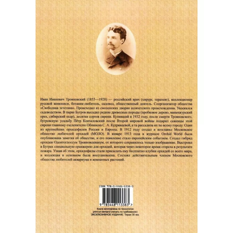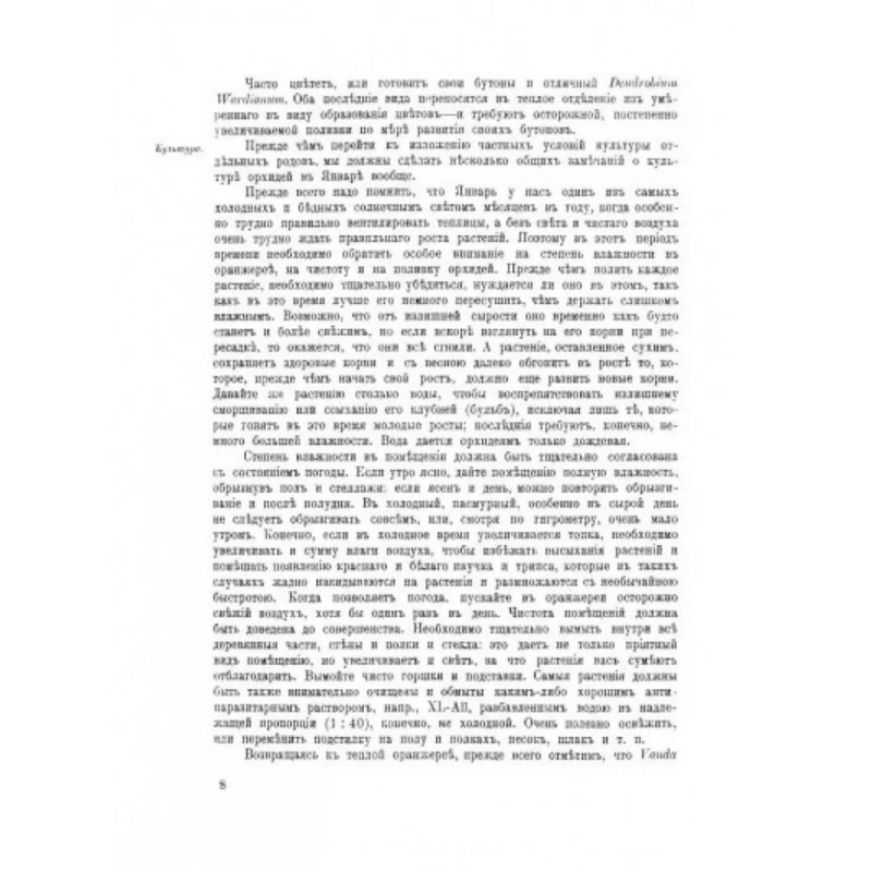 Культура орхидей. Руководство для любителей. Трояновский И.И. Репринт с издания. Москва, 1913. С 36 рис. (4 цветные).Уникальное издание, не потерявшее актуальности по сей день. Автор книги дает краткое и практичное описание тех условий, которые требуются для разведения орхидей и тех новейших способов и приемов их разведения, которые должен знать садовод-любитель для выращивания этих удивительных растений в суровых условиях российского климата. Методика И.И. Трояновского основана на комбинированном использовании трех типов оранжерей: теплой, холодной и умеренной. Прослеживая жизнь растений по месяцам на протяжении всего года, Трояновский дает подробные указания по культуре орхидей всех температурных групп, по сезонным работам и даже по устройству и отоплению оранжерей. Кроме того, в своей книге он характеризует большую часть известных в то время видов, их особенности выращивания и цветения. Завершают книгу ценные для любителей Краткие таблицы по культуре орхидей.Автор Иван Иванович Трояновский (1855 1928) талантливый врач, хирург и терапевт, широко известный в среде московской творческой интеллигенции как страстный любитель искусства, собиратель картин русских художников. В Европе же он был известен как орхидеист, организатор и председатель Московского общества любителей орхидей, создатель ныне утерянного гибрида Odontoglossum Troyanovskianum. Тираж 30 экз. выполнен по технологии print-on-demand.