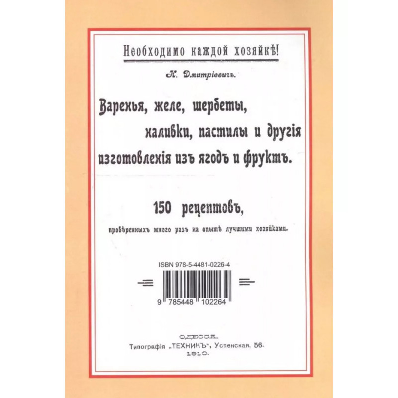 Лучшие московские блины, или практические наставления как печь блины и оладьи, состоящие из 24 правил+Варенья, желе, шербеты, наливки, пастилы и другие изготовления из ягод и фруктов. Дмитриевич Н. Репринт с издания. Москва 1854, Одесса 1911. Лучшие московские блины, или практические наставления как печь блины и оладьи, состоящие из 24 правил. 24 старинных рецептов приготовления блинов. + Варенья, желе, шербеты, наливки, пастилы и другие изготовления из ягод и фруктов. 150 рецептов, проверенных много раз на опыте лучшими хозяйками. Книга-перевертыш.