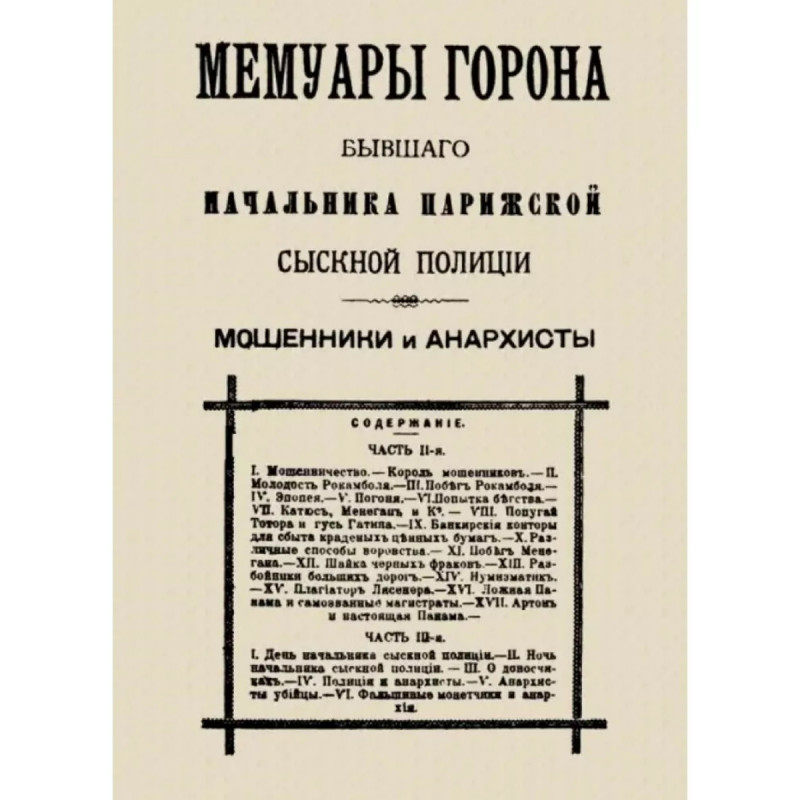 Мемуары Горона. Мошенники и Анархисты. Горон М.-Ф. Репринт с издания. Спб., 1897. 23 реальные истории. В книге множество мелких деталей быта того времени. Мари-Франсуа Горон (18471933) начальник Парижской сыскной полиции с 1886 по 1895 гг. - автор детективных историй, основанных на реальных событиях. Он участвовал в войнах на Мартинике и в Алжире, а также в войне 1870 г., записавшись простым солдатом. В 1875 г. он был лейтенантом, а затем стал капитаном запаса. В 1881 г. поступил в префектуру полиции Парижа. В 1882 г. он стал секретарем полицейского участка района Сен-Венсан-де-Поль в Париже. Его карьера была тогда стремительной: в 1886 г. он был назначен начальником Главного управления полиции Парижа. После выхода на пенсию в 1895 г. он открыл частную полицейскую фирму и начал писать свои мемуары, а затем детективные романы. Призванный добровольцем в начале войны в 1914 г., он служил во Втором бюро Генерального штаба (военная разведка).