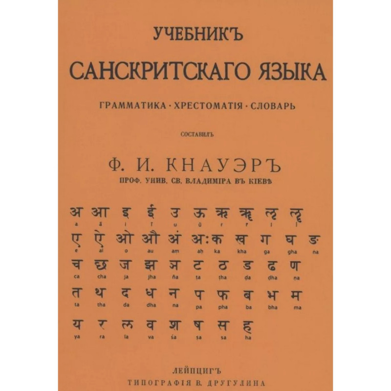 Учебник Санскритского Языка. Кнауэр Ф.И. Репринт с издания. Лейпциг, 1906.Кнауэр (Knauer) Федор (Фридрих) Иванович (Matthaus Friedrich) (1849-1917, Томск), доктор сравнительного языкознания, профессор по кафедре сравнительного языкознания и санскрита Университета св. Владимира (Киев). Учебник Ф. И. Кнауэра был напечатан в начале прошлого столетия, но до сих пор остается лучшим пособием на русском языке по изучению санскрита. В нем весьма удачно изложены нормы и особенности санскритской графики, фонетики, грамматики и словообразования. Книга, изданная в 1908 г., является переработанной версией "Руководства к изучению санскрита", изданного им ранее совместно с Миллером в 1891 г. Это не только учебник, но и грамматический справочник, к которому прилагаются упражнения, подборка текстов и санскритско-русский словарь.