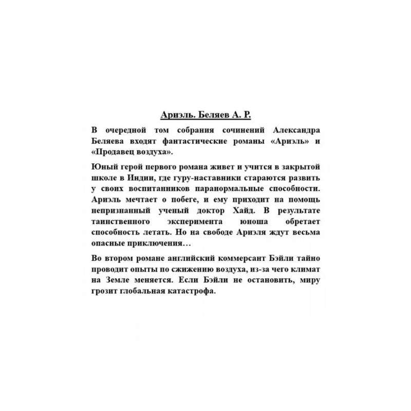 Ариэль. Беляев А. Р. В очередной том собрания сочинений Александра Беляева входят фантастические романы "Ариэль" и "Продавец воздуха". Юный герой первого романа живет и учится в закрытой школе в Индии, где гуру-наставники стараются развить у своих воспитанников паранормальные способности. Ариэль мечтает о побеге, и ему приходит на помощь непризнанный ученый доктор Хайд. В результате таинственного эксперимента юноша обретает способность летать. Но на свободе Ариэля ждут весьма опасные приключенияВо втором романе английский коммерсант Бэйли тайно проводит опыты по сжижению воздуха, из-за чего климат на Земле меняется. Если Бэйли не остановить, миру грозит глобальная катастрофа.