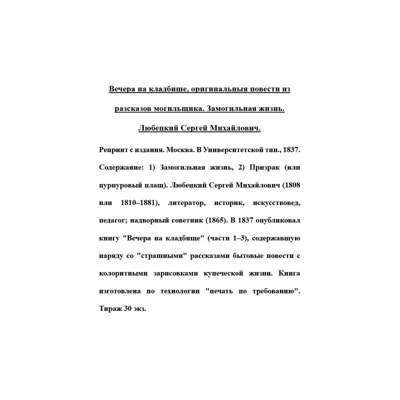 Вечера на кладбище, оригинальныя повести из разсказов могильщика. Замогильная жизнь. Любецкий С.М. Репринт с издания. Москва. В Университетской тип. , 1837. Содержание: 1) Замогильная жизнь, 2) Призрак (или пурпуровый плащ). Любецкий Сергей Михайлович (1808 или 1810 - 1881), литератор, историк, искусствовед, педагог; надворный советник (1865). В 1837 опубликовал книгу "Вечера на кладбище" (части 1-3), содержавшую наряду со "страшными" рассказами бытовые повести с колоритными зарисовками купеческой жизни. Книга изготовлена по технологии "печать по требованию". Тираж 30 экз.