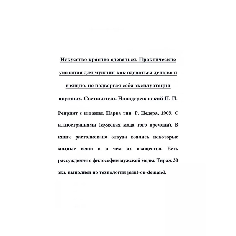 Искусство красиво одеваться. Практические указания для мужчин как одеваться дешево и изящно, не подвергая себя эксплуатации портных. Новодеревенский П.И. Репринт с издания. Нарва тип. Р. Педера, 1903. С иллюстрациями (мужская мода того времени). В книге растолковано откуда взялись некоторые модные вещи и в чем их изящество. Есть рассуждения о философии мужской моды. Тираж 30 экз. выполнен по технологии print-on-demand.