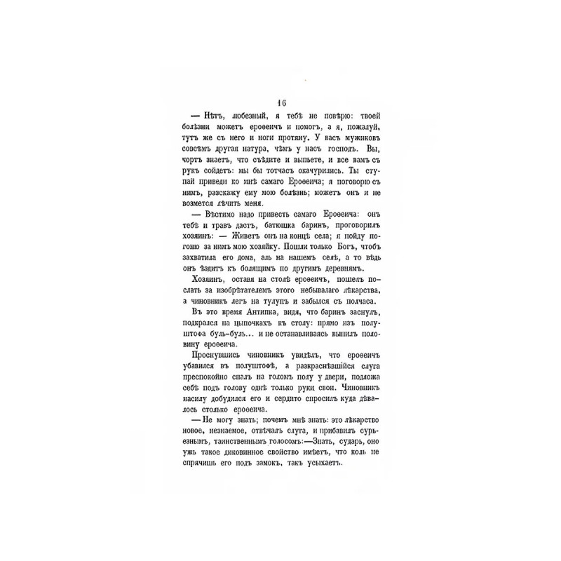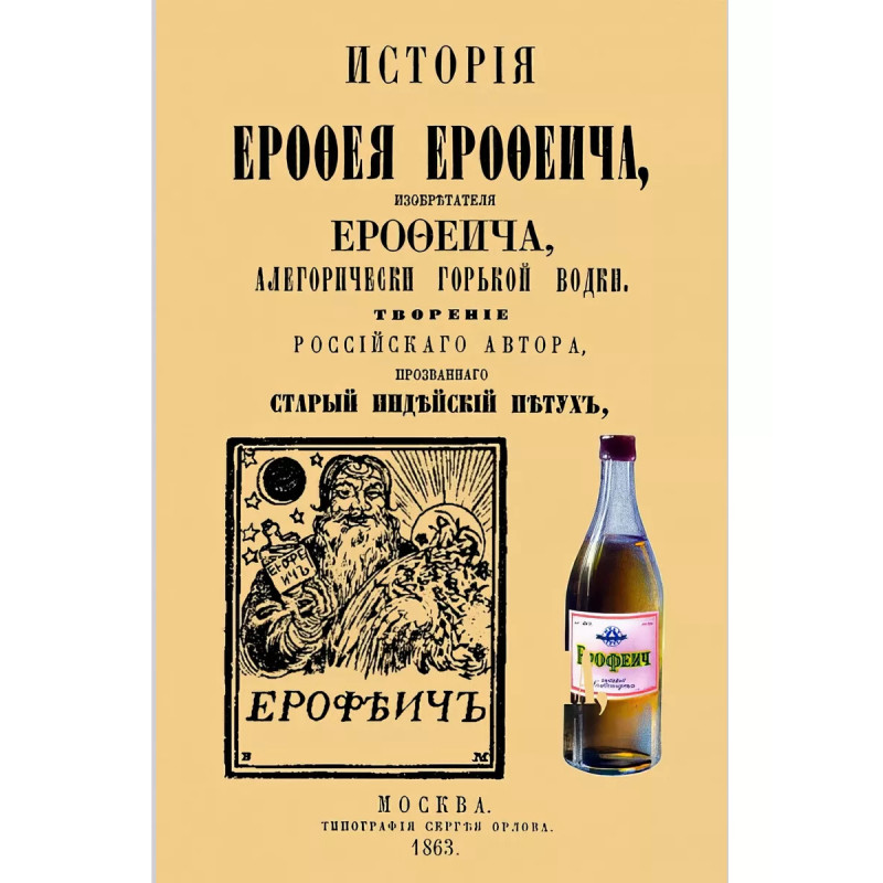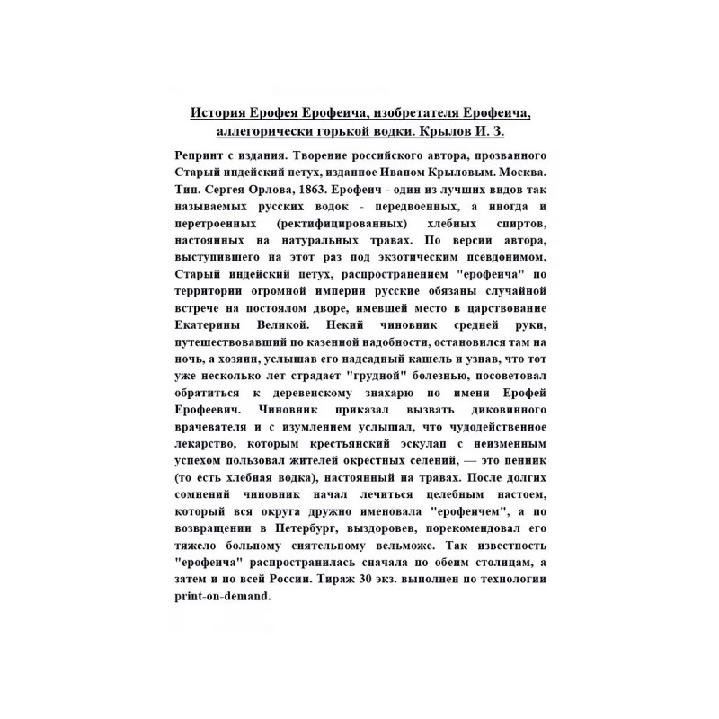 История Ерофея Ерофеича, изобретателя Ерофеича, аллегорически горькой водки. Крылов И.З. Репринт с издания. Творение российского автора, прозванного Старый индейский петух, изданное Иваном Крыловым. Москва. Тип. Сергея Орлова, 1863. Ерофеич - один из лучших видов так называемых русских водок - передвоенных, а иногда и перетроенных (ректифицированных) хлебных спиртов, настоянных на натуральных травах. По версии автора, выступившего на этот раз под экзотическим псевдонимом, Старый индейский петух, распространением "ерофеича" по территории огромной империи русские обязаны случайной встрече на постоялом дворе, имевшей место в царствование Екатерины Великой. Некий чиновник средней руки, путешествовавший по казенной надобности, остановился там на ночь, а хозяин, услышав его надсадный кашель и узнав, что тот уже несколько лет страдает "грудной" болезнью, посоветовал обратиться к деревенскому знахарю по имени Ерофей Ерофеевич. Чиновник приказал вызвать диковинного врачевателя и с изумлением услышал, что чудодейственное лекарство, которым крестьянский эскулап с неизменным успехом пользовал жителей окрестных селений, это пенник (то есть хлебная водка), настоянный на травах. После долгих сомнений чиновник начал лечиться целебным настоем, который вся округа дружно именовала "ерофеичем", а по возвращении в Петербург, выздоровев, порекомендовал его тяжело больному сиятельному вельможе. Так известность "ерофеича" распространилась сначала по обеим столицам, а затем и по всей России. Тираж 30 экз. выполнен по технологии print-on-demand.