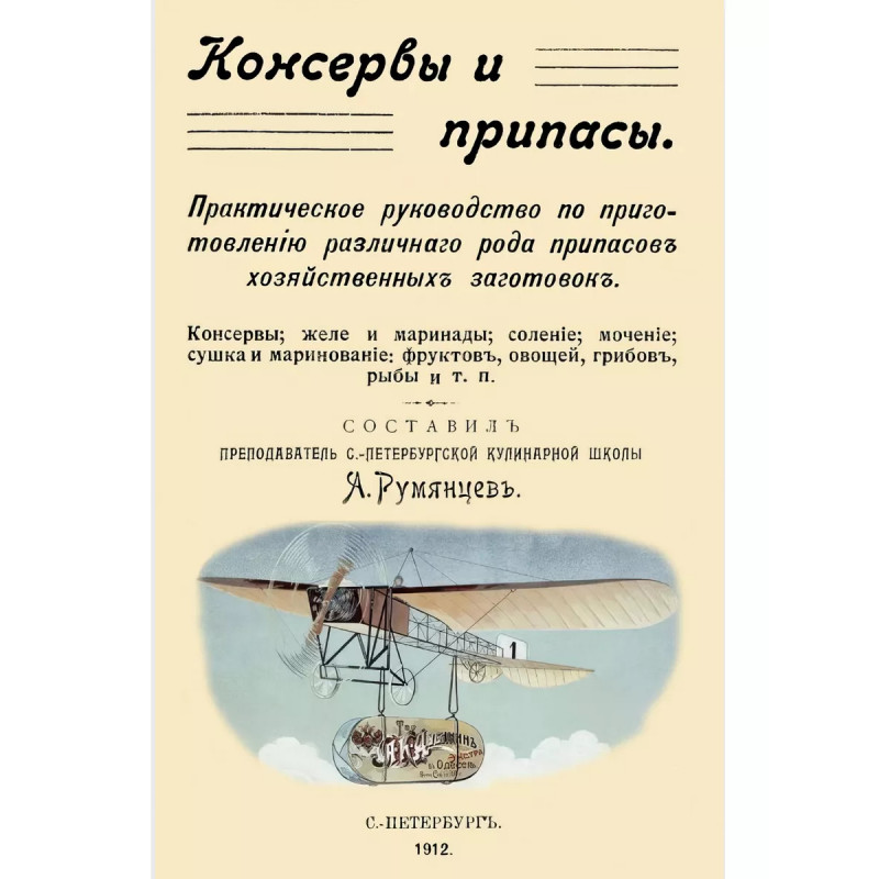 Консервы и припасы. Румянцев А. Репринт с издания. Санкт-Петербург, книгоиздательства А. Ф. Сухова, 1912. Практическое руководство по приготовлению различного рода припасов и хозяйственных заготовок. Консервы, желе и маринады, соление, мочение, сушка и маринование: фруктов, овощей, гривилтабов, рыбы и т. п. Румянцев - преподаватель С. -Петербургской кулинарной школы. Сборник редких старинных рецептов. Тираж 30 экз. выполнен по технологии print-on-demand. Составитель: Румянцев А. 2-е издание, исправленное и дополненное.
