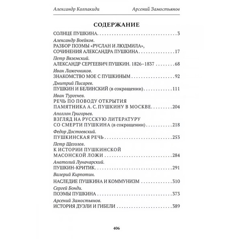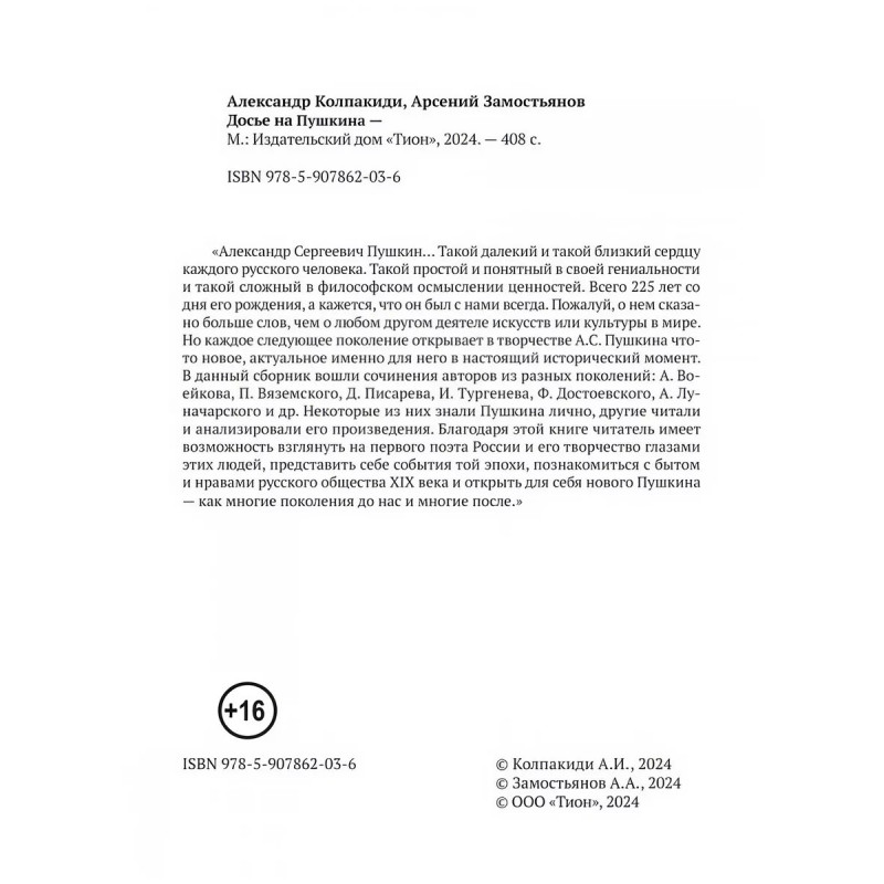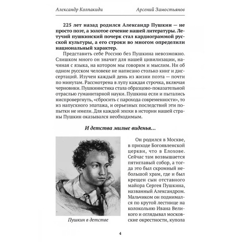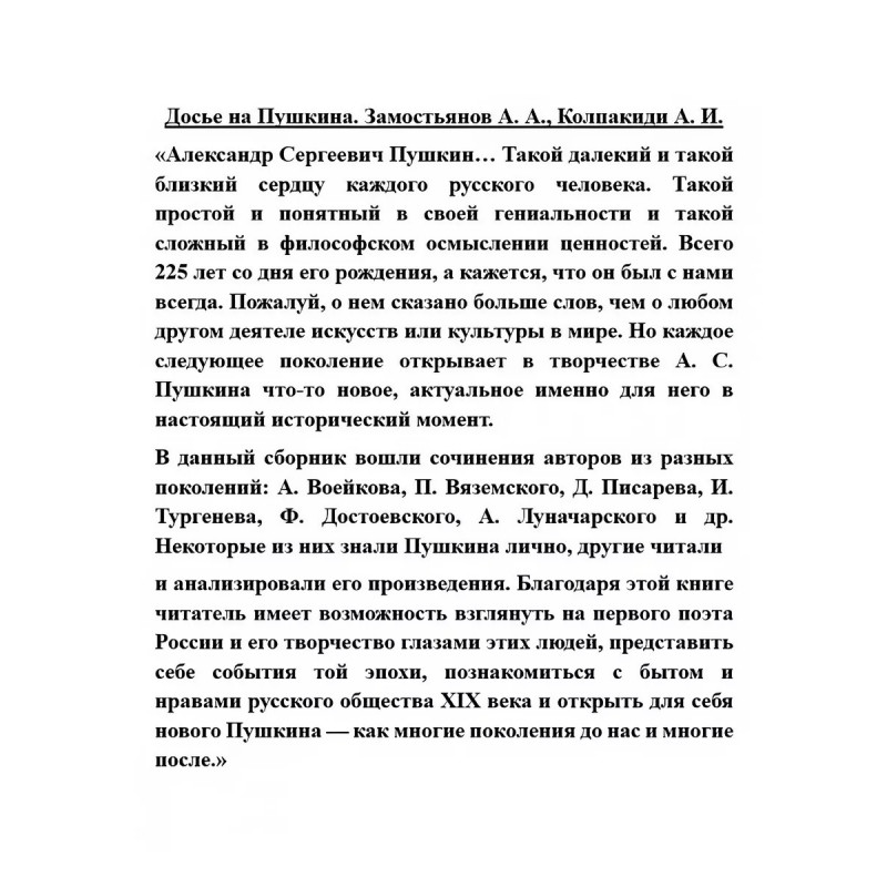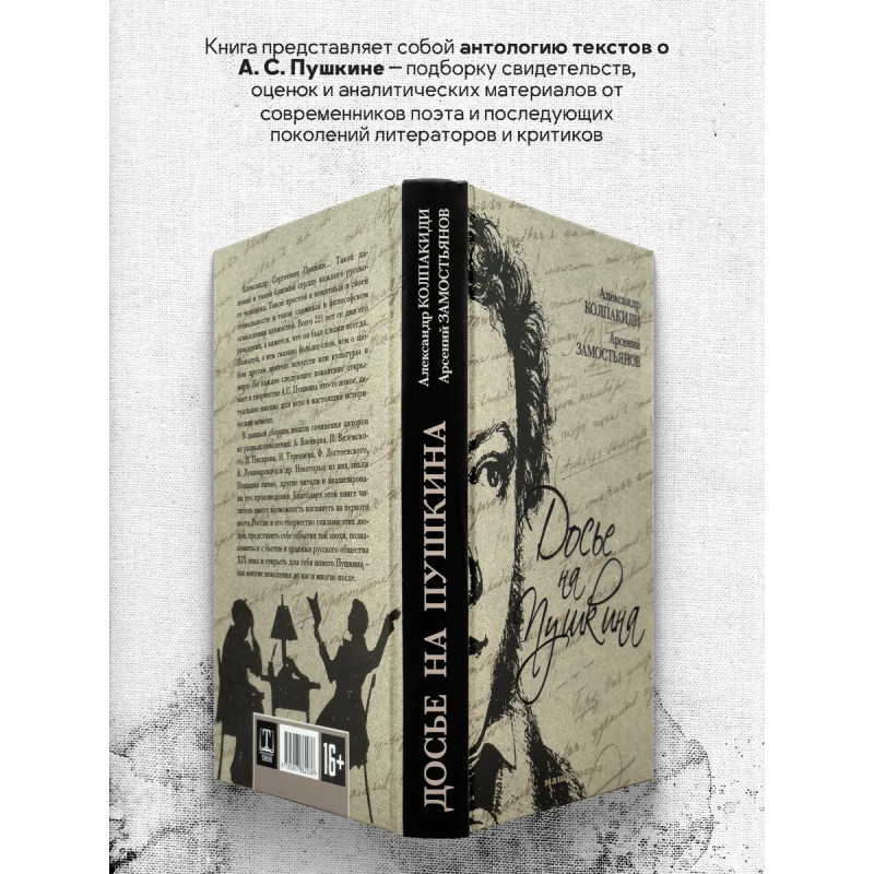 Досье на Пушкина. Замостьянов А.А., Колпакиди А.И. "Александр Сергеевич Пушкин Такой далекий и такой близкий сердцу каждого русского человека. Такой простой и понятный в своей гениальности и такой сложный в философском осмыслении ценностей. Всего 225 лет со дня его рождения, а кажется, что он был с нами всегда. Пожалуй, о нем сказано больше слов, чем о любом другом деятеле искусств или культуры в мире. Но каждое следующее поколение открывает в творчестве А. С. Пушкина что-то новое, актуальное именно для него в настоящий исторический момент.В данный сборник вошли сочинения авторов из разных поколений: А. Воейкова, П. Вяземского, Д. Писарева, И. Тургенева, Ф. Достоевского, А. Луначарского и др. Некоторые из них знали Пушкина лично, другие читалии анализировали его произведения. Благодаря этой книге читатель имеет возможность взглянуть на первого поэта России и его творчество глазами этих людей, представить себе события той эпохи, познакомиться с бытом и нравами русского общества XIX века и открыть для себя нового Пушкина как многие поколения до нас и многие после."