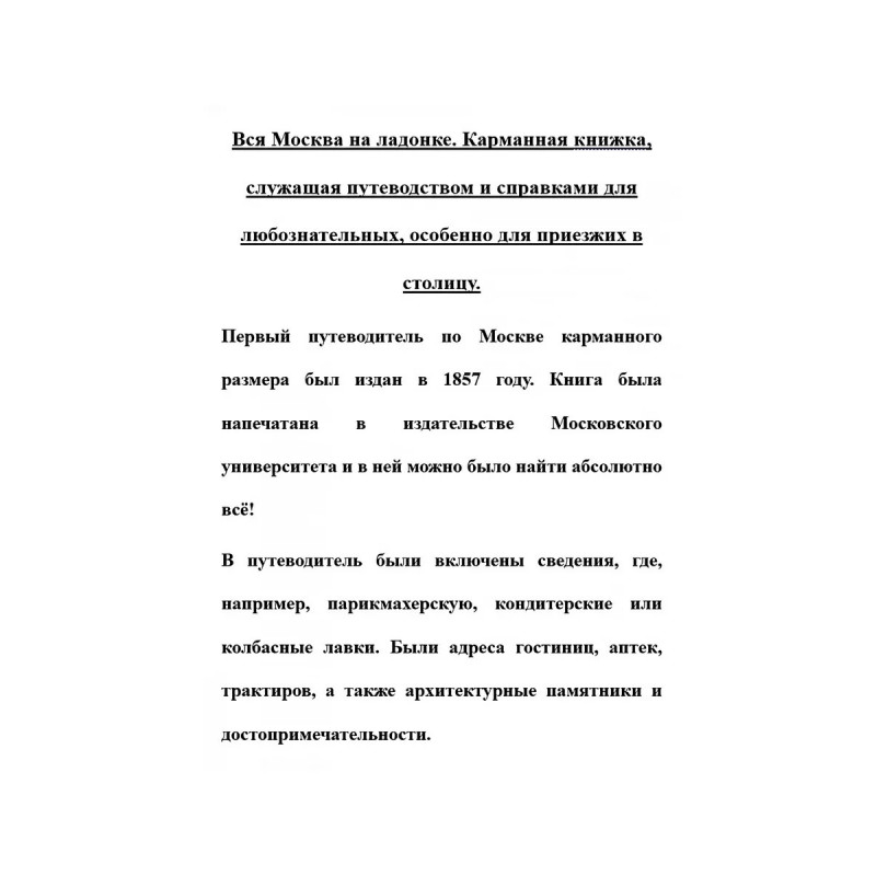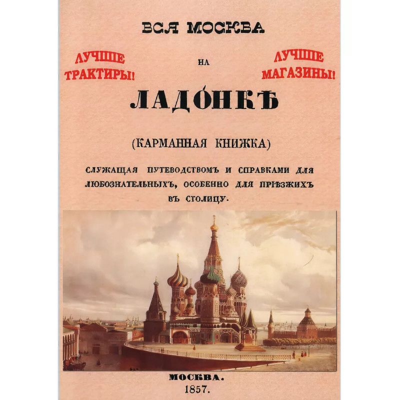 Вся Москва на ладонке. Карманная книжка, служащая путеводством и справками для любознательных, особенно для приезжих в столицу. Первый путеводитель по Москве карманного размера был издан в 1857 году. Книга была напечатана в издательстве Московского университета и в ней можно было найти абсолютно всё!В путеводитель были включены сведения, где, например, парикмахерскую, кондитерские или колбасные лавки. Были адреса гостиниц, аптек, трактиров, а также архитектурные памятники и достопримечательности.