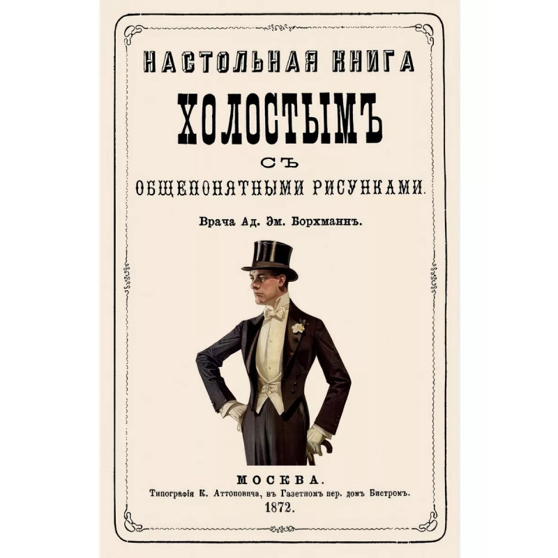 Настольная книга холостым с общепонятными рисунками. Борхман А. Э. Репринт с издания. Москва, 1872. Содержание: Краткая анатомия и физиология половых органов. Значение половых органов на наше тело и рассудок. Злоупотребление половыми сношениями и Онанизм. Секретные болезни с практическими замечаниями распознавания и лечения: Насекомое. Лишай. Угри половых органов. Разрыв уздечки. Триппер головки детороднаго члена. Триппер из мочеваго канала. Сужение мочеваго канала. Семятечение. Шанкр и Сифилис. Тираж 30 экз. выполнен по технологии print-on-demand.
