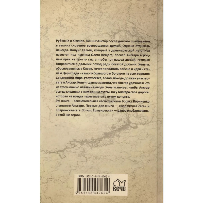 Варяжская сага. Пряди Ансгара. Корниенко Б. С. Рубеж IX и X веков. Викинг Ансгар после долгого пребывания в землях словенов возвращается домой. Однако отдыхать некогда. Конунг Хельги, который в древнерусской летописи известен под именем Олега Вещего, послал Ансгара в родные края не просто так, а чтобы тот нашел людей, готовых отправиться в дальний поход ради богатой добычи. Хельги, обосновавшись в Киеве, хочет пополнить войско и идти к стенам Царьграда самого большого и богатого из всех городов Срединного мира. Разумеется, в этом походе должен участвовать и Ансгар. Конунг давно заметил, что Ансгар удачлив и что из этого можно извлечь выгоду. Хельги желает, чтобы Ансгар всегда следовал с ним одним путем, но у Ансгара своя дорога, которая не всегда пересекается с путем конунга. Эта книга заключительная часть трилогии Бориса Корниенко о викинге Ансгаре. Первые две книги Варяжская сага и Варяжская сага. Золото Ёрмунрекка ранее опубликованы в этой же серии.