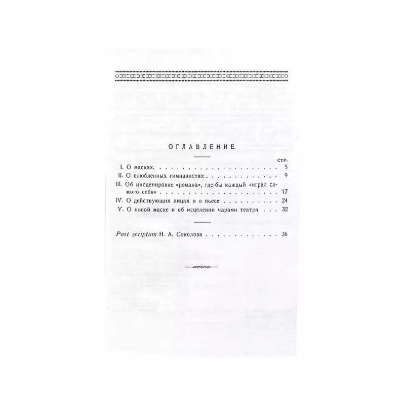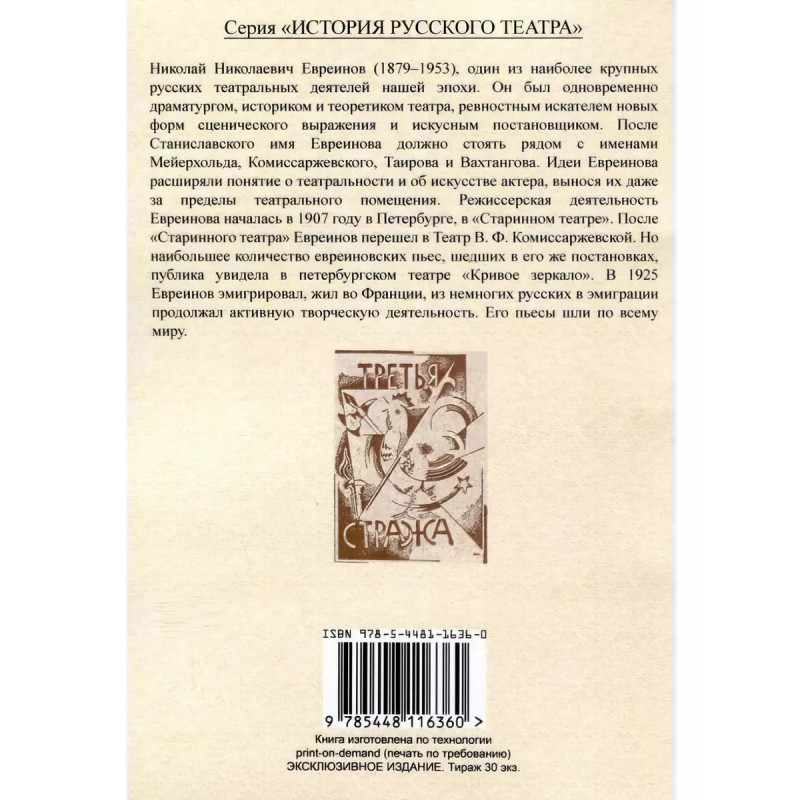 О новой маске (Автобио-реконструктивной). Евреинов Н.Н. Прижизненное издание. Петроград, 1923. Книгоиздательство "Третья стража".Оригинальная обложка. Сохранность удовлетворительная.Послесловие Н.А.Соколова. Маска на обложке - из рисунков Гордона Крэга к пьесе "Маска любви".Два рода "масок" известны в теории театра - психологическая и прагматическая. Психологическая обязывает к преображению самого стержня лицедейской души, прагматическая же не требует от актера преображения своего "я", но мыслит, чувствует себя в иной действительности.Маска автобио-реконструктивная (повторение самого себя, но в прошлом) пока не знакома театру. Обращение "момента прошлого" в "момент настоящего" возможно только при такой инсцене, во главе угла которой положен строгий до последней мелочи, ассоциативный метод. Порой от второстепенного зависит здесь главнейшее.