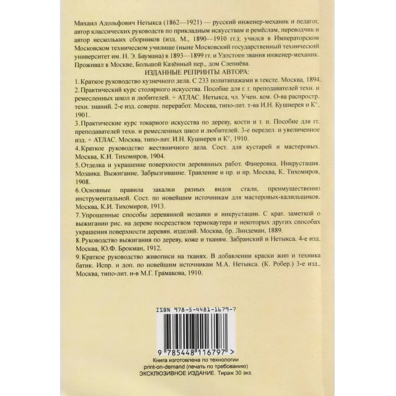 Отделка и украшение поверхности деревянных работ. Инкрустация. Мозаика. Выжигание. Забрызгивание. Травление и пр. и пр. Нетыкса М.А. Отделка и украшение поверхности деревянных работ : Фанеровка. Инкрустация. Мозаика. Выжигание. Забрызгивание. Травление и пр. и пр. / М.А. Нетыкса. Москва : К. Тихомиров, 1908 г.Книга изготовлена по технологии print-on-demand(печать по требованию)Эксклюзивное издание. Тираж 30 экз.Книга напечатана на русском языке с дореволюционной (дореформенной) орфографией.