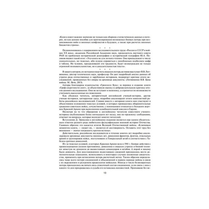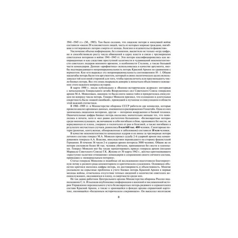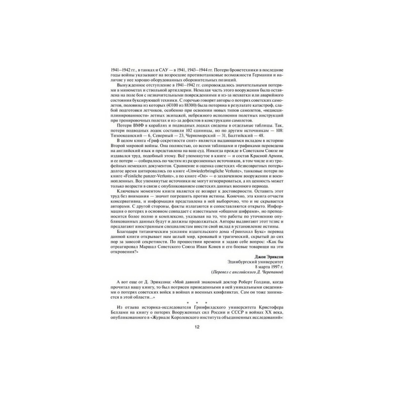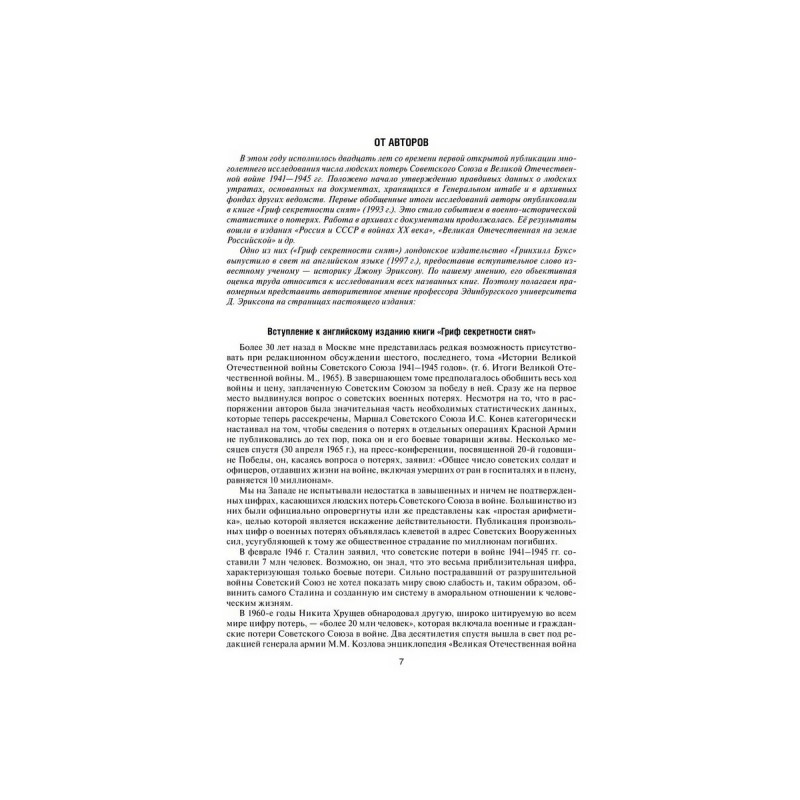 Авторская группа Генерального штаба и Военно-мемориального центра ВС РФ, ныне Департамент МО РФ по увековечению памяти погибших при защите Отечества, используя ранее закрытые для печати архивные документы Генерального штаба и главных штабов видов Вооруженных Сил, МВД, ФСБ, погранвойск и других архивных учреждений бывшего СССР, исследовала итоги проведенных советскими войсками операций во время Великой Отечественной войны. Авторы существенно уточнили общие потери людей и военной техники по периодам, кампаниям войны, по фронтам и флотам, отдельным армиям и военным флотилиям. В книге также представлены уточненные сведения о составе войск противника и его потерях. Кроме того, показано количество захоронений, расположенных на территории России и за рубежом. Данное дополненное издание является уникальным, неоднократно переиздавалось в России и не имеет аналогов в современной военно-исторической литературе.