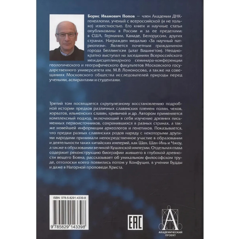 Третий том посвящается скрупулезному восстановлению подробной истории предков различных славянских племен: полян, чехов, хорватов, ильменских славян. кривичей и др. Автором применяется комплексный подход, включающий в себя изучение древних письменных первоисточников, сохранившихся в разных странах, а также новейшей информации археологов и генетиков. Показывается, что предки разных славянских родов наряду с некоторыми другими народами принимали непосредственное участие в образовании и деятельности таких китайских империй, как Шан. Шан-Инь и Чжоу, а также в образовании великой Кушанской империи. Отдельная глава содержит реконструкцию биографии жившею в глубокой древности вещего Бояна; рассказывает об уникальном философском труде, ополоски коего появились потом у Конфуция, в учении Будды и даже в Нагорной проповеди Христа. Книга может быть интересна как историкам, так и кругу заинтересованных читателей.