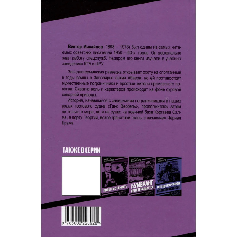 Западногерманская разведка открывает охоту на спрятанный в годы войны в Заполярье архив Абвера, но ей противостоят мужественные пограничники и простые жители приморского посёлка. Схватка воль и характеров происходит на фоне суровой северной природы. История, начавшаяся с задержания пограничниками в наших водах торгового судна Ганс Вессель, продолжилась затем не только в море, но и на суше: на военной базе Коргаева Салма, в порту Георгий, возле гранитной скалы с названием Чёрная Брама.