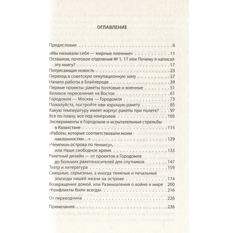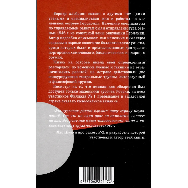 Вернер Альбринг вместе с другими немецкими учеными и специалистами жил и работал на маленьком острове Городомля. Немецкие специалисты по управляемым ракетам были отправлены туда осенью 1946 г. из советской зоны оккупации Германии. Автор подробно описывает, как немецкие инженеры создавали первые советские баллистические ракеты, среди которых были и предназначенные для транспортировки химического, биологического и ядерного оружия. Жизнь на острове имела свой определенный распорядок, но немецкие ученые и техники не ограничивались работой: на острове действовали две конкурирующие театральные труппы, литературный и философский кружки. Несмотря на то, что немцам для обозрения был доступен только маленький кусочек России, на всех участников Филиала №1 пребывание в загадочной стране оказало колоссальное влияние.