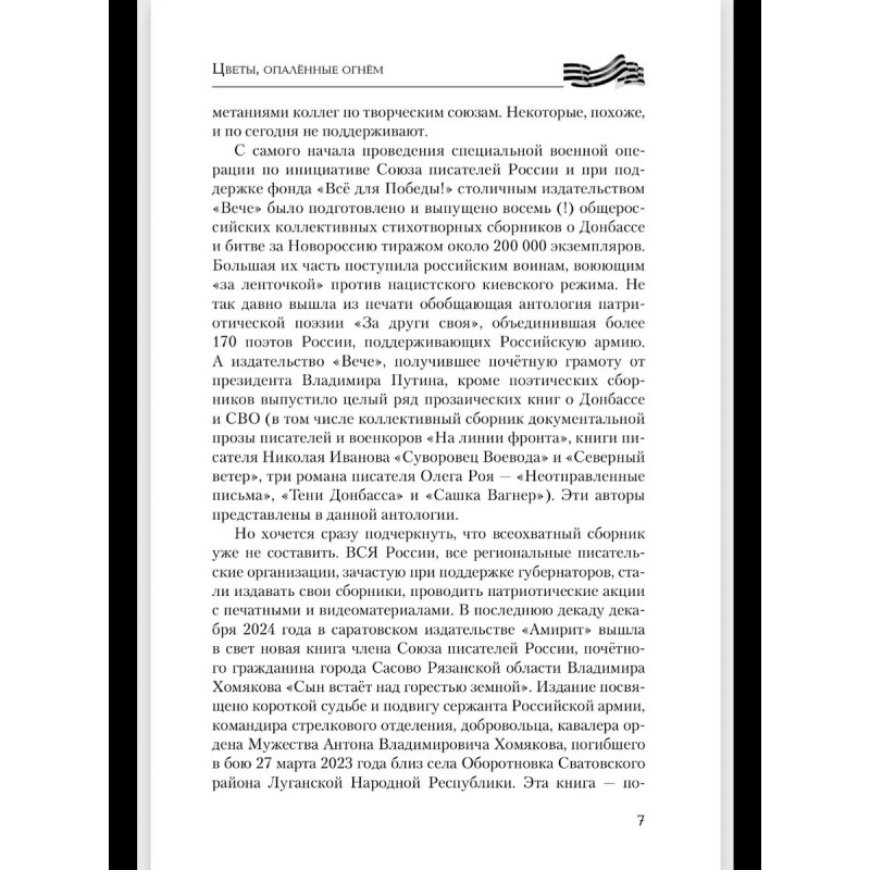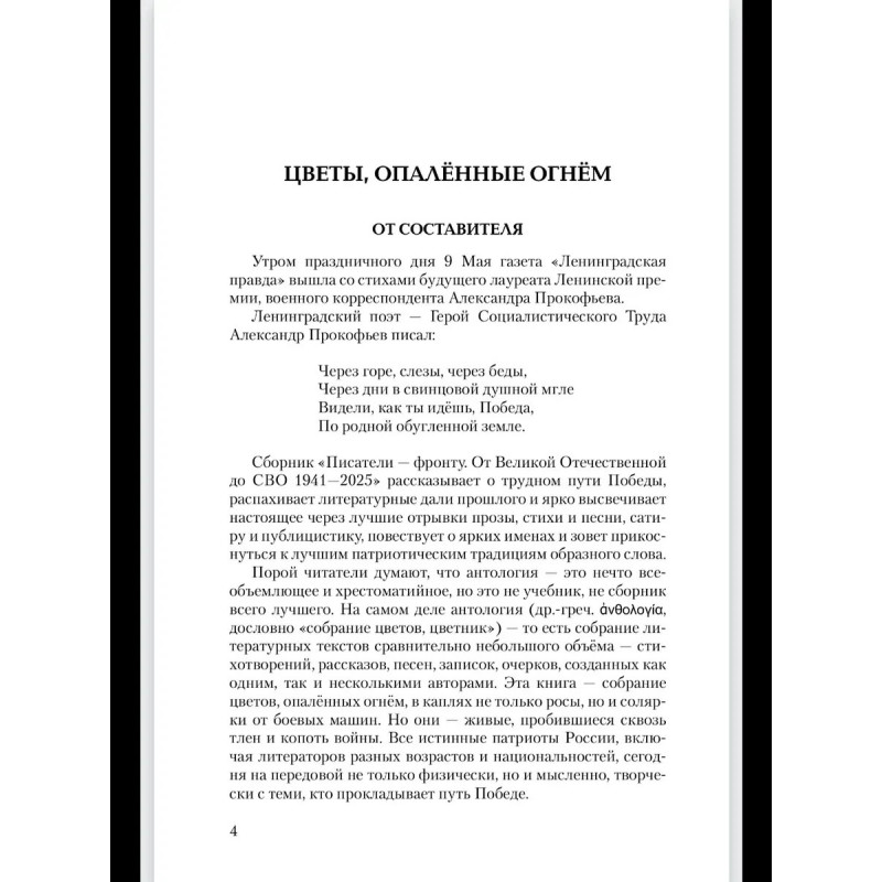 В книге, которая выпускается в Год защитника Отечества и 80-летия Великой Победы, перекликаются две эпохи Великая Отечественная война и Специальная военная операция, нашедшие отражение в отечественной литературе. Сборник рассказывает о пути Победы, распахивает литературные дали прошлого и ярко высвечивает настоящее через лучшие отрывки прозы, через стихи и песни, сатиру и публицистику, повествует о ярких именах и зовёт прикоснуться к лучшим патриотическим традициям образного слова.