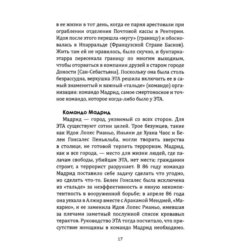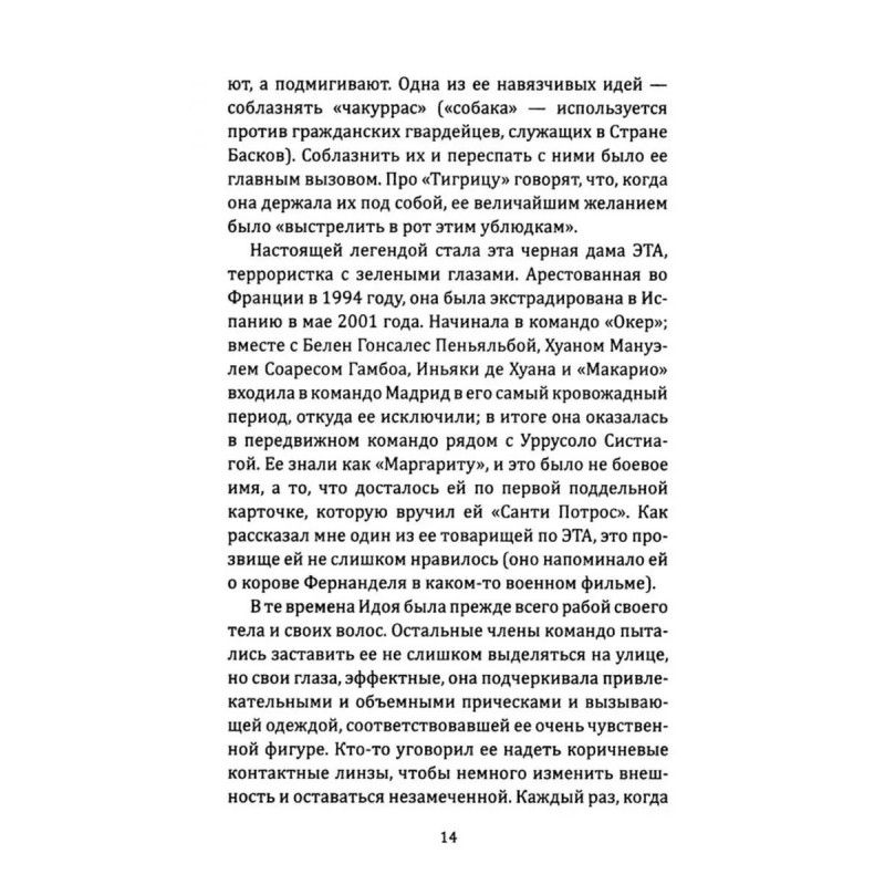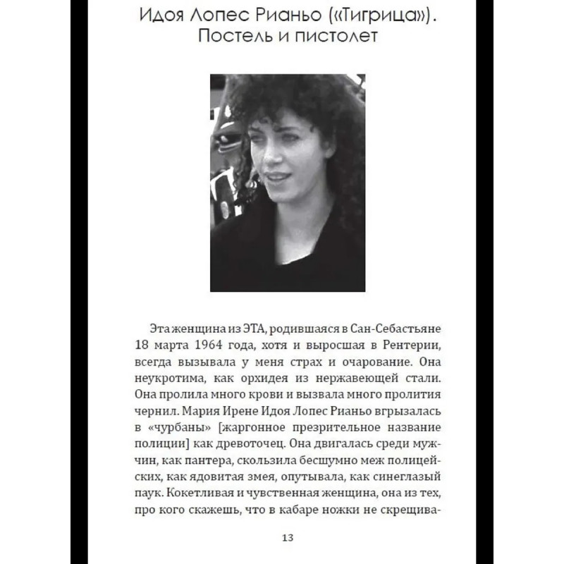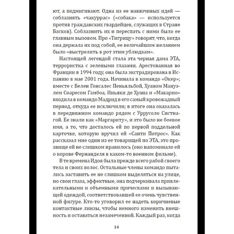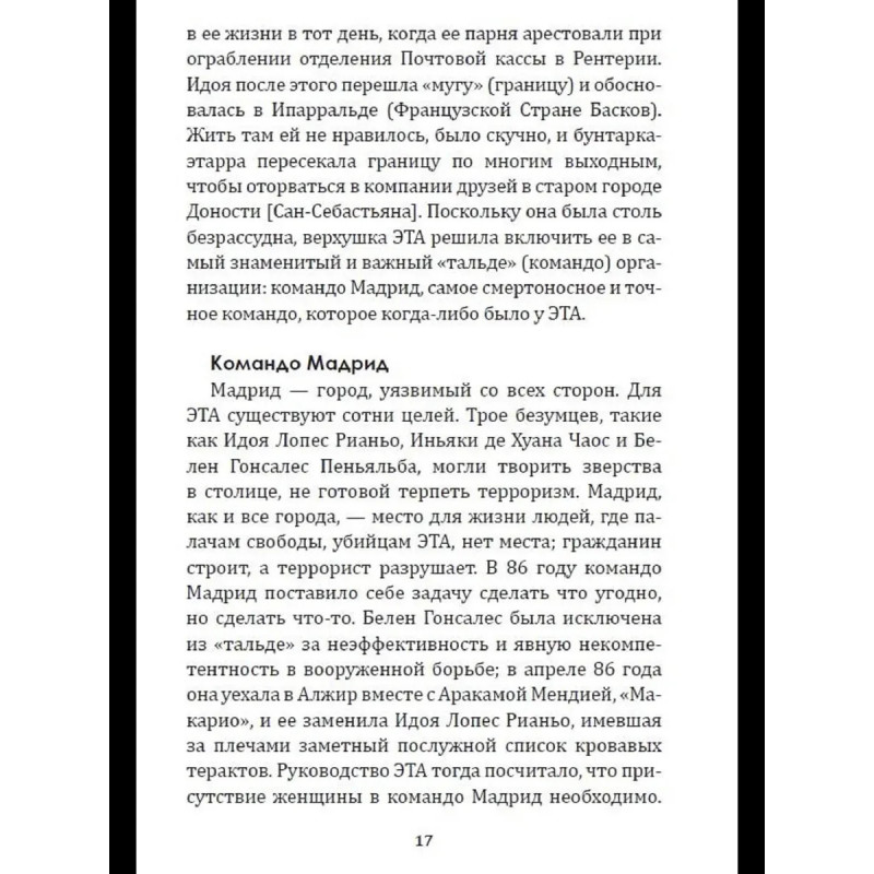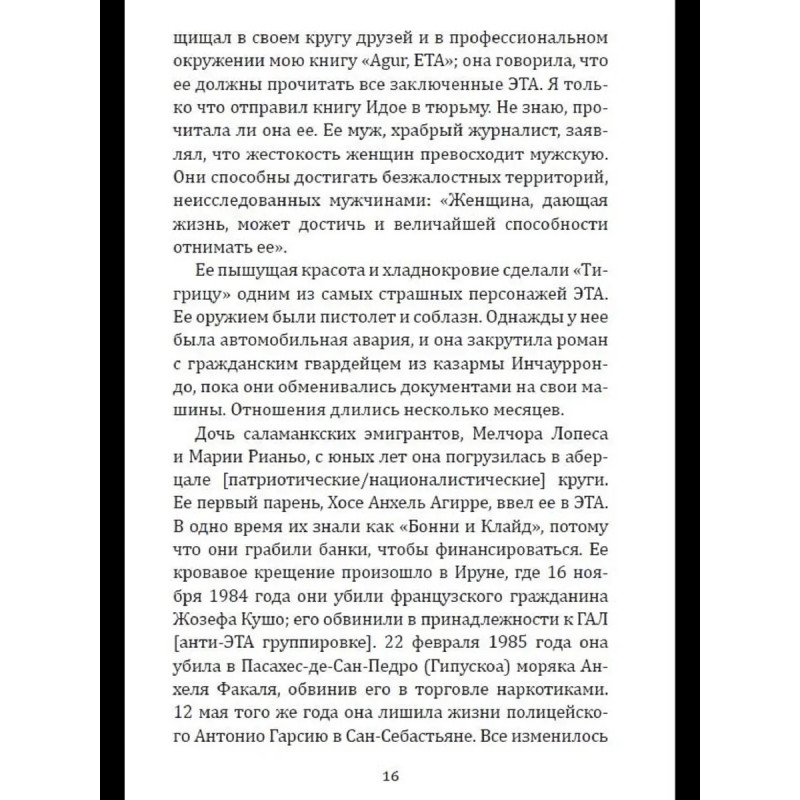 ЭТА - легендарная повстанческая организация баскских горцев. Устроенная по клановому принципу и исповедующая радикальную левизну, она превратилась в одну из самых кровавых и могущественных партизанских групп прошлого и нынешнего века. В отличии от RAF она не была уничтожена и продолжает борьбу до сих пор. Эта книга раскрывает руководящую роль женщин в организации. У басков женщины часто становятся во главе клана, и ЭТА, как клановая организация, была полна женщинами во главе. Это - первоклассное журналистское расследование, в котором раскрываются до сих пор неизвестные политические аспекты, а также человеческие истории. Автор провел тщательное исследование, используя личные дневники и свидетельства друзей некоторых из этих женщин, чтобы приблизить нас к их личностям, сомнениям, противоречиям.