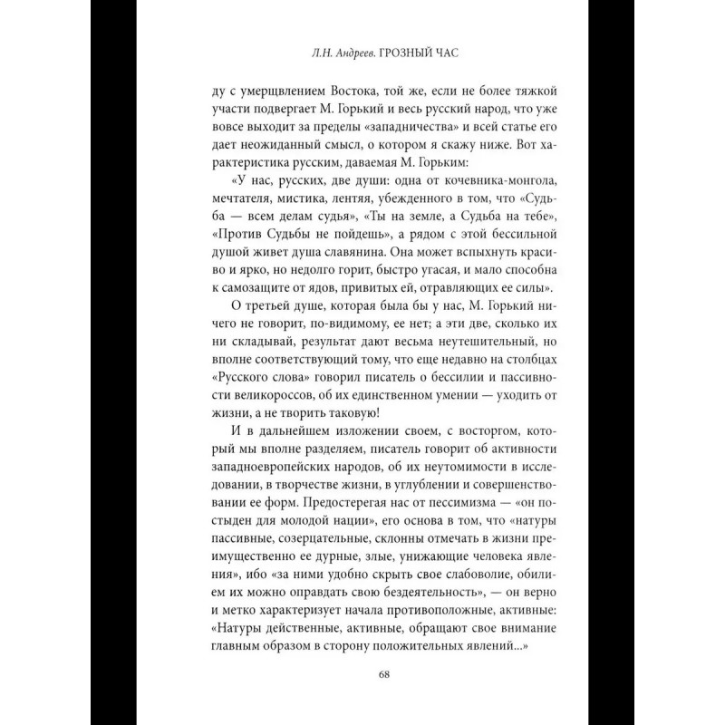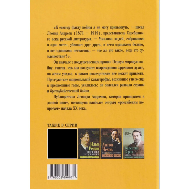 «К самому факту войны я не могу привыкнуть. — писал Леонид Андреев (1871-1919), представитель Серебряного века русской литературы. -Миллион людей, собравшись в одно место, убивают друг друга, и всем одинаково больно, и все одинаково несчастны, — что же это такое, ведь это сумасшествие?».Он вначале с воодушевлением принял Первую мировую войну, считая, что она послужит возрождению «русского духа», но затем увидел, к каким последствиям все может привести. Предчувствие национальной катастрофы, возникшее у него еще в предвоенные годы, усилилось: он опасался развала страны и братоубийственной бойни.Публицистика Леонида Андреева, которая приводится в данной книге, посвящена наиболее острым «российским вопросам» начала XX века.