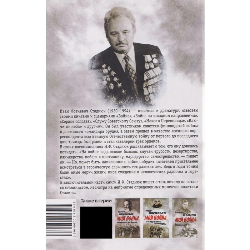 Иван Фотиевич Стаднюк (1920-1994) - писатель и драматург, известен своими книгами и сценариями "Война", "Война на западном направлении", "Сердце солдата", "Служу Советскому Союзу", "Максим Перепелица", "Ключи от неба" и другими. Он был участником советско-финляндской войны в должности командира орудия, а затем прошел в качестве военного корреспондента всю Великую Отечественную войну от первого до последнего дня; трижды был ранен и стал кавалером трех орденов. В своих воспоминаниях И. Ф. Стаднюк рассказывает о том, что ему довелось повидать. "На войне ведь всякое бывало: случаи трусости, дезертирства, паникерства, побеги к противнику, мародерство, самострельство, - пишет он. - Но, может быть, написанное о войне побудит читателей пристальнее всмотреться в героическую сложность тех далеких лет. Ведь в годы войны были иные мерки жизни, иное суждение о человеческих радостях и горестях". В заключительной части книги И. Ф. Стаднюк пишет о том, почему он остался сталинистом, несмотря на неприятие определенных моменто