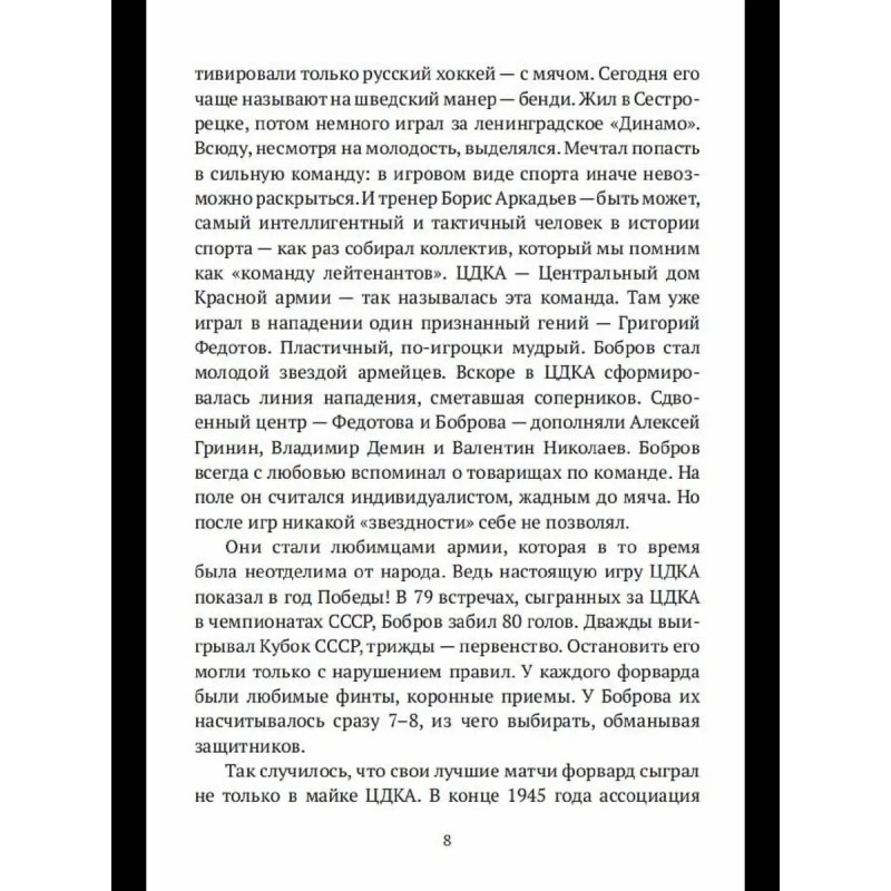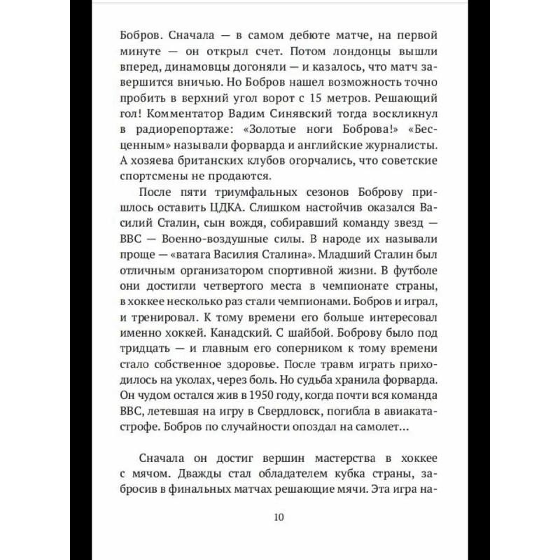Эту книгу написал уникальный спортсмен, надолго обогнавший свое время и в футболе, и в хоккее. Форвард Всеволод Бобров был настоящим любимцем послевоенной публики в СССР, но он покорил и весь мир, начиная с легендарного турне 1945 года по Великобритании. Рекорды Боброва невозможно превзойти: он был лучшим и на футбольном поле, и на хоккейных аренах. Привел сборную СССР к золотым медалями чемпионатов мира и как игрок, и как наставник. И в футболе, и в хоккее отличался поразительной результативностью. Эта книга - воспоминания великого мастера, который с восхищением пишет о товарищах по командам, о самых захватывающих матчах. И - излагает свои взгляды на футбол и хоккей, на воспитание спортсменов. Ведь Бобров был не только выдающимся спортсменом, но и незаурядным тренером. Книга предназначена для всех, кто неравнодушен к спорту, к истории нашей страны, к людям, покорившим мир своим талантом.