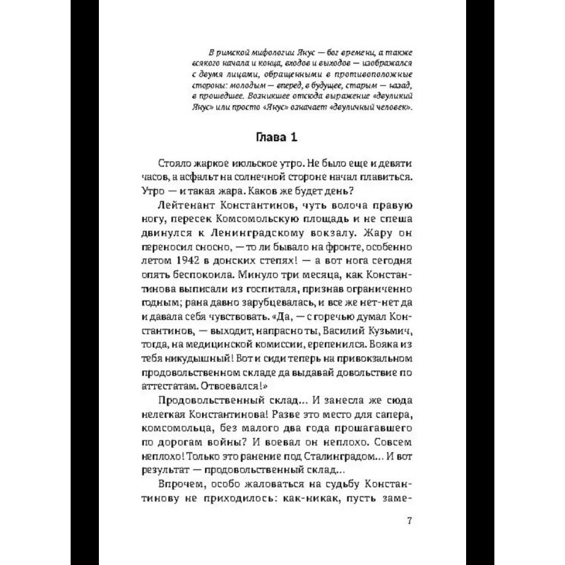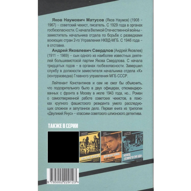 Лейтенант Константинов и сам не смог бы объяснить, что подозрительного было в двух офицерах, откомандированных с фронта в Москву в июле 1943 года, но. Роман о самоотверженной работе советских чекистов, в поисках крупного фашистского резидента умело расследующих сложное и запутанное дело. Первая книга из трилогии "Двуликий Янус" - классики советского шпионского детектива.