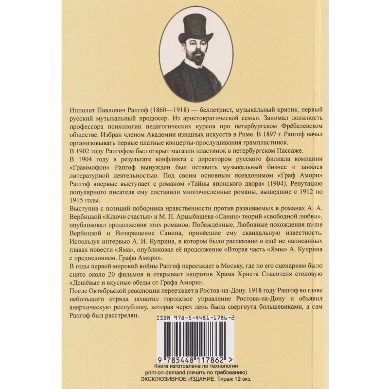 Возвращение Санина - одно из многочисленных произведений *скандалезного продолжателя в литературе известных романов*, как отзывались об авторе современники. Граф Амори - это литературный псевдоним Ипполита Павловича Рогова (1860 - 1918), выпускника СПб, консерватории, человека образованного, разностороннего и... предприимчивого. Его перу принадлежат *Побежденные* (Окончание романа *Ключи счастья* А. Вербицкой) (1912), *Любовные похождения m-me Вербицкой* (1913) реакция на недовольство писательницы по поводу написания продолжения ее романа, *Рабы страсти* (1913), *Финал* Роман из современной жизни. (Окончание произведения Яма А. Куприна) (1913), Кавалеры Шнейдер. Авантюрный роман из жизни Высшего света Петрограда (1915) и др. Роману Возвращение Санина (1914) продолжению популярного в то время эротического романа Арцыбашева Санин.