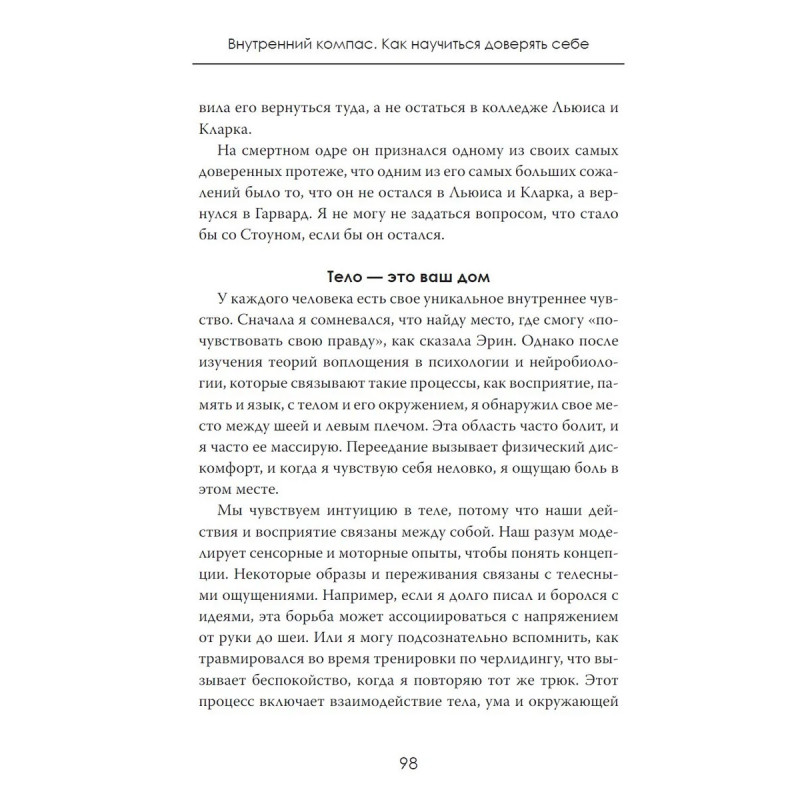 Почему мы так часто сомневаемся в себе, даже когда ответы уже внутри нас?Почему доверяем чужому мнению больше, чем собственному ощущению?Внутренний компас. Как научиться доверять себе это книга о том, как вернуть себе главный навык, потерянный в шуме внешних советов и ожиданий: умение слышать и понимать себя. Автор ведёт читателя по пути самопознания от анализа страхов и сомнений к обретению внутренней опоры. Здесь вы найдёте практики, которые помогут научиться распознавать голос собственной интуиции, отличать его от навязанных убеждений и принимать решения, которые действительно ведут к вашему счастью. Эта книга не о том, как угодить другим, а о том, как перестать теряться в чужих картах и наконец довериться своему внутреннему компасу.