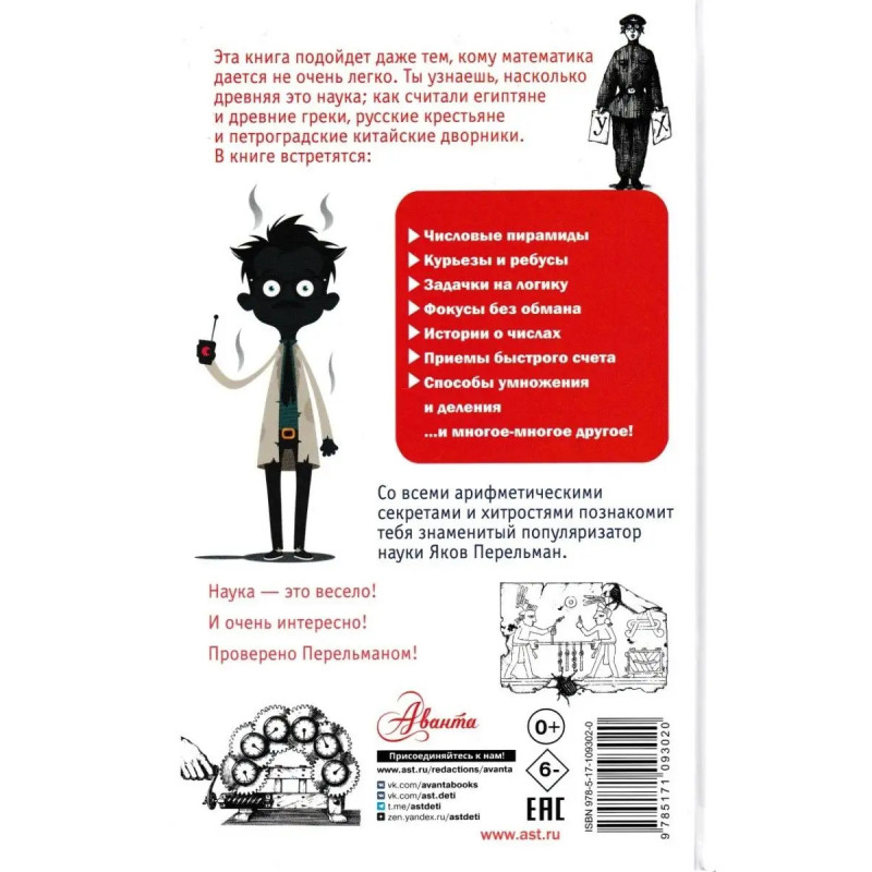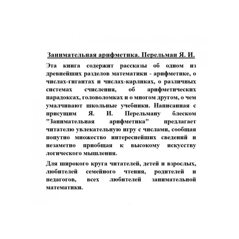 Занимательная арифметика. Перельман Я. И. Эта книга содержит рассказы об одном из древнейших разделов математики - арифметике, о числах-гигантах и числах-карликах, о различных системах счисления, об арифметических парадоксах, головоломках и о многом другом, о чем умалчивают школьные учебники. Написанная с присущим Я. И. Перельману блеском "Занимательная арифметика" предлагает читателю увлекательную игру с числами, сообщая попутно множество интереснейших сведений и незаметно приобщая к высокому искусству логического мышления. Для широкого круга читателей, детей и взрослых, любителей семейного чтения, родителей и педагогов, всех любителей занимательной математики.