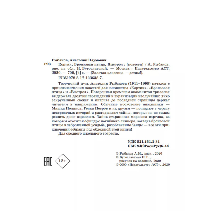 Кортик. Бронзовая птица. Выстрел. Творческий путь Анатолия Рыбакова 1911-1998 начался с приключенческих повестей для юношества Кортик, Бронзовая птица и Выстрел. Поверенная временем знаменитая трилогия выдержала десятки переизданий и экранизаций неслучайно: лихо закрученный сюжет и интрига до последней страницы держат читателя в напряжении. Обычные московские школьники Мишка Поляков, Генка Петров и их друзья попадают в череду невероятных историй и разгадывают тайны, которые не по силам решить даже взрослым. Тайна старинного морского кортика, за которым охотится офицер с погибшего линкора, загадка бронзовой птицы в заброшенной усадьбе, разоблачение банды все эти приключения собраны под обложкой этой книги!Для среднего школьного возраста.