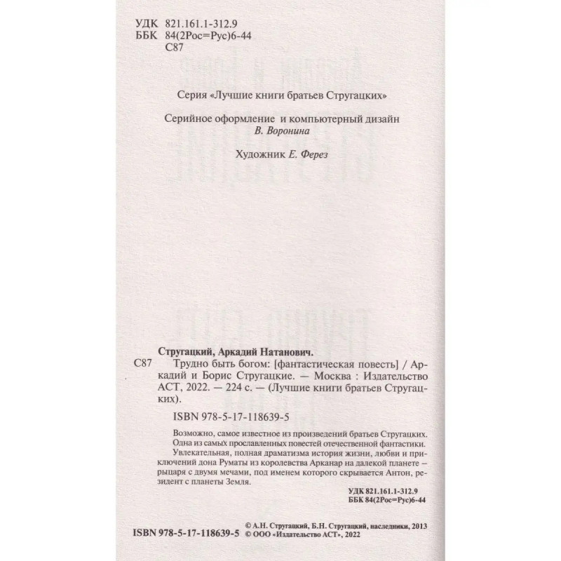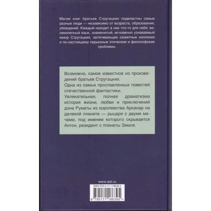 Трудно быть богом. Возможно, самое известное из произведений братьев Стругацких. Один из самых прославленных повестей отечественной фантастики. Увлекательная, полная драматизма история жизни, любви и приключений дона Руматы из королевства Арканар на далекой планете рыцаря с двумя мечами, под именем которого скрывается Антон, резидент с планеты Земля.