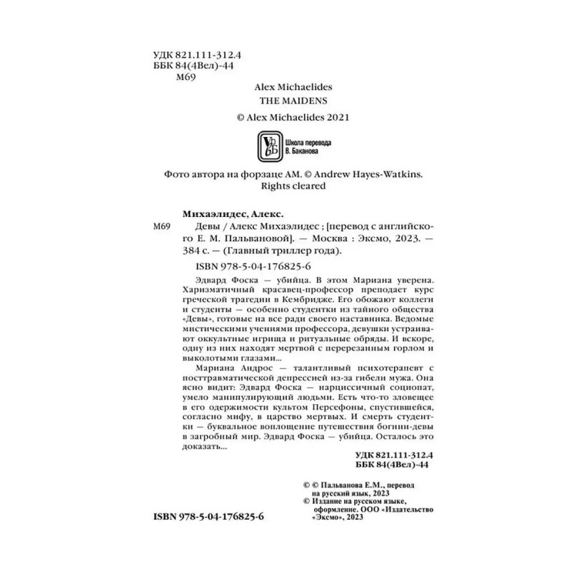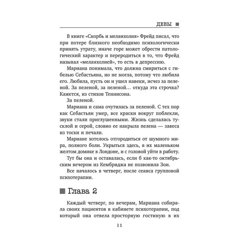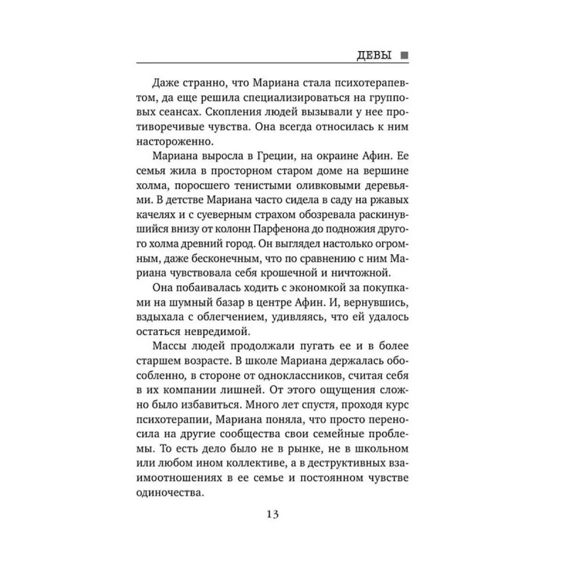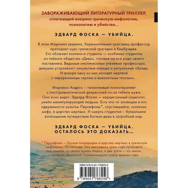 Девы. Завораживающий литературный триллер, сплетающий воедино греческую мифологию, психологию и убийство Эдвард Фоска - убийца. В этом Мариана уверена. Харизматичный красавец-профессор преподает курс греческой трагедии в Кембридже. Его обожают коллеги и студенты - особенно студентки из тайного общества "Девы", готовые на все ради своего наставника. Ведомые мистическими учениями профессора, девушки устраивают оккультные игрища и ритуальные обряды. И вскоре, одну из них находят мертвой с перерезанным горлом и выколотыми глазами... Мариана Андрос - талантливый психотерапевт с посттравматической депрессией из-за гибели мужа. Она ясно видит: Эдвард Фоска - нарциссичный социопат, умело манипулирующий людьми. Есть что-то зловещее в его одержимости культом Персефоны*, спустившейся, согласно мифу, в царство мертвых. И смерть студентки - буквальное воплощение путешествия богини-девы в загробный мир.