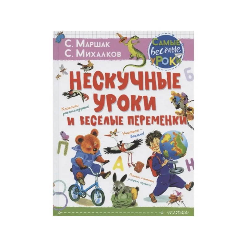 Нескучные уроки и весёлые переменки. Классики рекомендуют. Книга "Нескучные уроки и весёлые переменки" состоит из нескольких разделов: "Учим буквы", "Считаем", "Играем", "Мир вокруг нас" и "Рисуем". В каждой части ребёнку предлагается прочитать стихи С. Маршака и С. Михалкова и познакомиться с буквами, цифрами, временами года, научиться рисовать. На каждой странице ребят ждут интересные задания. Учиться с классиками детской литературы очень интересно!