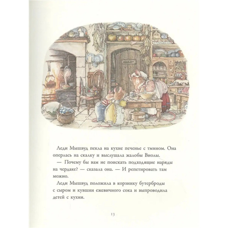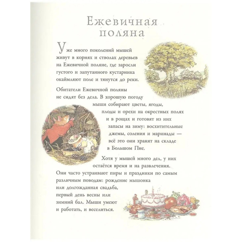 ISBN 978-5-17-136096-2. Вот уже много поколений мышей живут в маленьких домиках на Ежевичной поляне, прячась ото всех в корнях и стволах деревьев. Мышки никогда не сидят без дела: они собирают урожай на полях, готовят запасы орехов и ягод на зиму, чтобы потом насладиться невероятными джемами, пудингами и соленьями в приятной компании возле камина. Но у каждого жителя Ежевичной поляны всегда найдётся время для веселья и развлечений: будь это день рождения или первый день весны. Забавные и трогательные истории о мышатах на Ежевичной поляне впервые были опубликованы в 1980 году. Автор Джилл Барклем долго изучала природу и быт Англии XIX века, прежде чем приступить к написанию книг."Приключения на Ежевичной поляне" - это сборник, включающий в себя рассказы "Высокие холмы", "Дети Фиалочки", "Тайная лестница" и "Морская история".