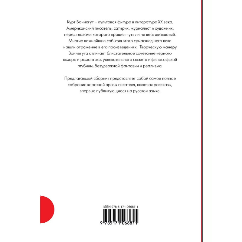 Полное собрание рассказов. Курт Воннегут культовая фигура в литературе ХХ века. Американский писатель, сатирик, журналист и художник, перед глазами которого "прошел" чуть ли не весь двадцатый. Многие важнейшие события этого сумасшедшего века нашли отражение в его произведениях. Творческую манеру Воннегута отличают блистательное сочетание черного юмора и романтики, увлекательного сюжета и философской глубины, безудержной фантазии и реализма.Предлагаемый сборник представляет собой самое полное собрание короткой прозы писателя, включая рассказы, впервые публикующиеся на русском языке.