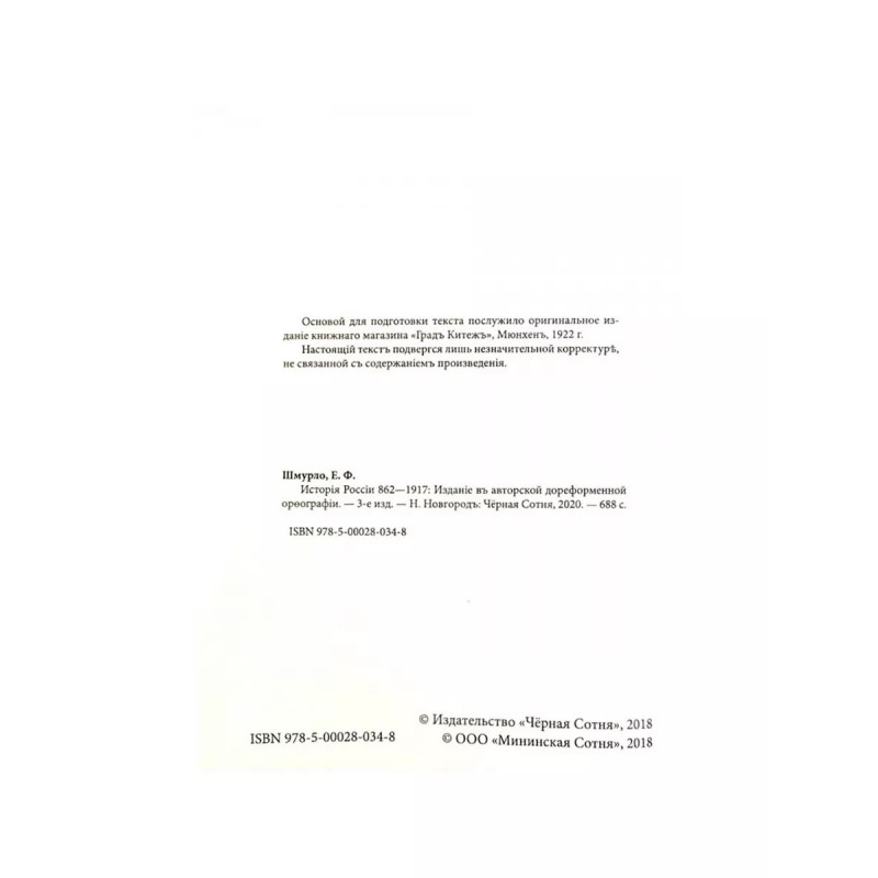 История России 8621917. 3-е издание. Шмурло Е. Ф. Издание в дореформенной авторской орфографии. Шмурло Евгений Францевич (18531934) выдающийся русский историк, один из основателей Императорского Русского исторического общества при Петербургском университете (1889). С 1903 года занимал должность учёного корреспондента Академии наук в Италии, с 1911 года являлся членом-корреспондентом РАН по разряду историко-политических наук. Находясь в эмиграции, основал Русское историческое общество в Праге, преподавал в Русском народном университете, являлся доктором Падуанского университета и почётным членом пражского славянского института. Оставил после себя более двухсот пятидесяти научных статей, книг и монографий. История России, 8621917 одна из итоговых, центральных работ 40-летней научной деятельности крупнейшего историка русского зарубежья. Написанная для обучения русского юношества, вынужденного познавать родину на расстоянии, данная книга сумела в полной мере вобрать в себя лучшие традиции отечественной историографии петербургской школы и личные наработки Евгения Францевича.