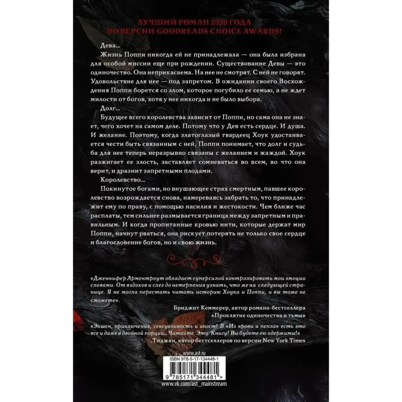 ISBN 978-5-17-134448-1. Из крови и пепла. Дева Жизнь Поппи никогда ей не принадлежала она была избрана для особой миссии еще при рождении. Жизнь Девы это одиночество. Она неприкасаема. На нее не смотрят. С ней не говорят. Удовольствие для нее под запретом. В ожидании своего Восхождения Поппи борется со злом, которое погубило ее семью, а не ждет милости от богов, хотя у нее никогда и не было выбора. Долг Будущее всего королевства зависит от Поппи, но сама она не знает, чего хочет на самом деле. Потому что у Дев есть сердце. И душа. И желание. И когда златоглазый гвардеец Хоук удостаивается чести быть связанным с ней, Поппи понимает, что долг и судьба для нее теперь неразрывно связаны с желанием и жаждой. Хоук разжигает ее злость, заставляет сомневаться во всем, во что она верит, и дразнит запретными плодами. Королевство Покинутое богами, но внушающее страх смертным, павшее королевство возрождается снова, намереваясь забрать то, что принадлежит ему по праву, с помощью насилия и жестокости.