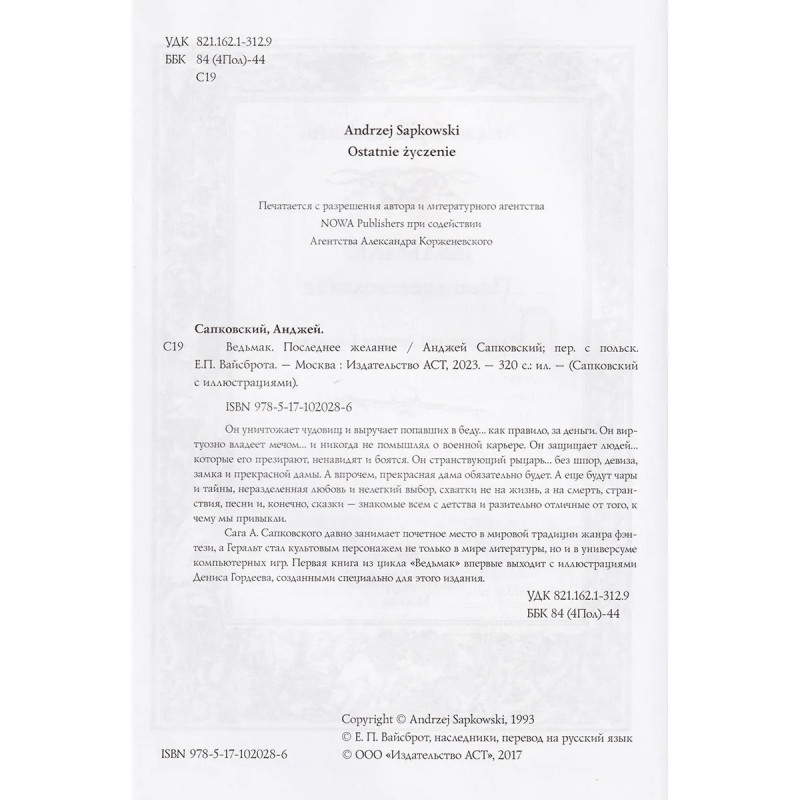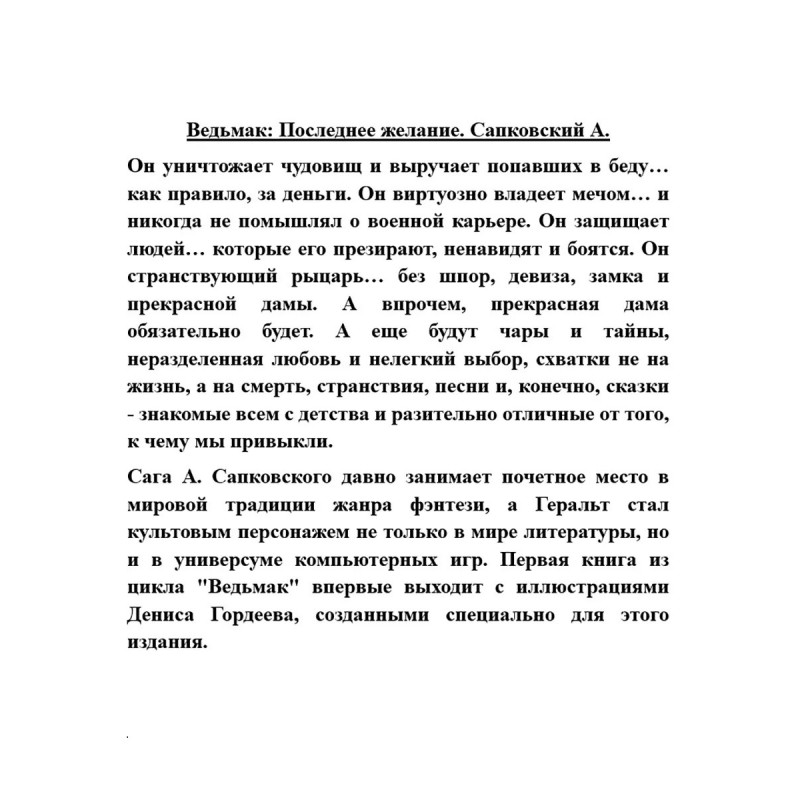 Ведьмак: Последнее желание. Он уничтожает чудовищ и выручает попавших в беду как правило, за деньги. Он виртуозно владеет мечом и никогда не помышлял о военной карьере. Он защищает людей которые его презирают, ненавидят и боятся. Он странствующий рыцарь без шпор, девиза, замка и прекрасной дамы. А впрочем, прекрасная дама обязательно будет. А еще будут чары и тайны, неразделенная любовь и нелегкий выбор, схватки не на жизнь, а на смерть, странствия, песни и, конечно, сказки знакомые всем с детства и разительно отличные от того, к чему мы привыкли. Сага А. Сапковского давно занимает почетное место в мировой традиции жанра фэнтези, а Геральт стал культовым персонажем не только в мире литературы, но и в универсуме компьютерных игр. Первая книга из цикла "Ведьмак" впервые выходит с иллюстрациями Дениса Гордеева, созданными специально для этого издания.
