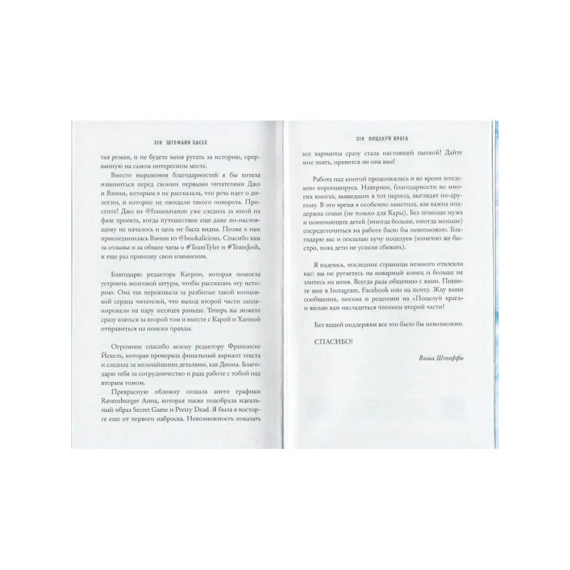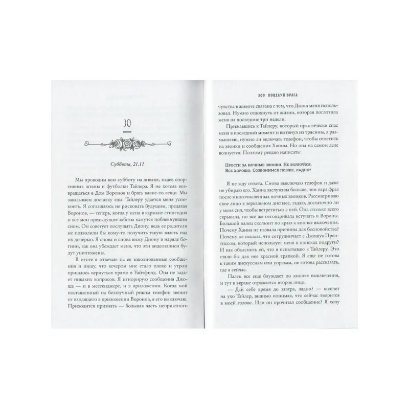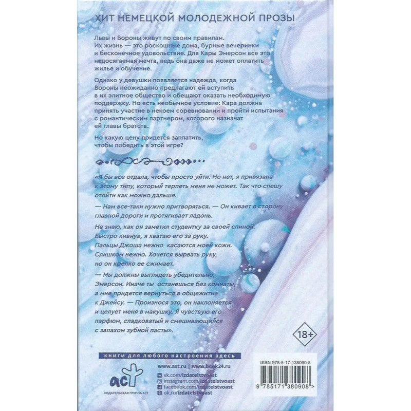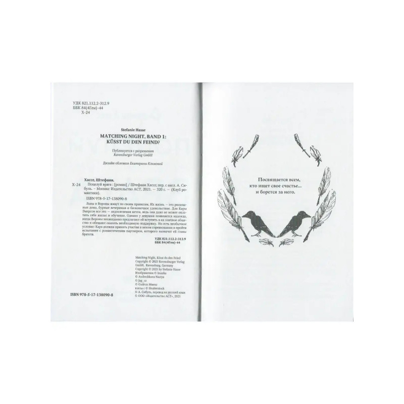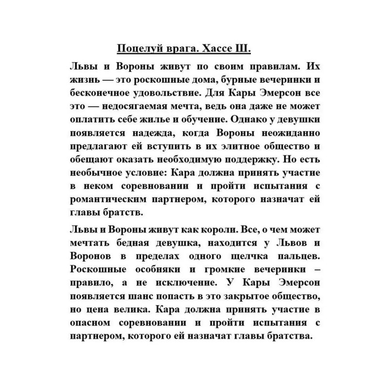 ISBN 978-5-17-138090-8. Поцелуй врага. Хассе Ш. Львы и Вороны живут по своим правилам. Их жизнь это роскошные дома, бурные вечеринки и бесконечное удовольствие. Для Кары Эмерсон все это недосягаемая мечта, ведь она даже не может оплатить себе жилье и обучение. Однако у девушки появляется надежда, когда Вороны неожиданно предлагают ей вступить в их элитное общество и обещают оказать необходимую поддержку. Но есть необычное условие: Кара должна принять участие в неком соревновании и пройти испытания с романтическим партнером, которого назначат ей главы братств. Львы и Вороны живут как короли. Все, о чем может мечтать бедная девушка, находится у Львов и Воронов в пределах одного щелчка пальцев. Роскошные особняки и громкие вечеринки правило, а не исключение. У Кары Эмерсон появляется шанс попасть в это закрытое общество, но цена велика. Кара должна принять участие в опасном соревновании и пройти испытания с партнером, которого ей назначат главы братства.