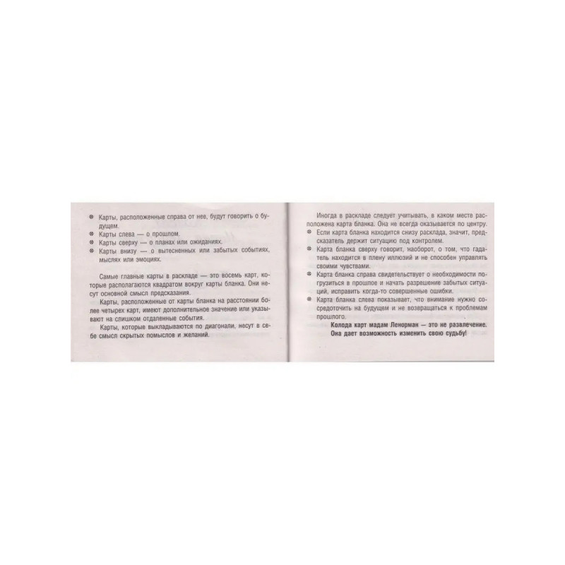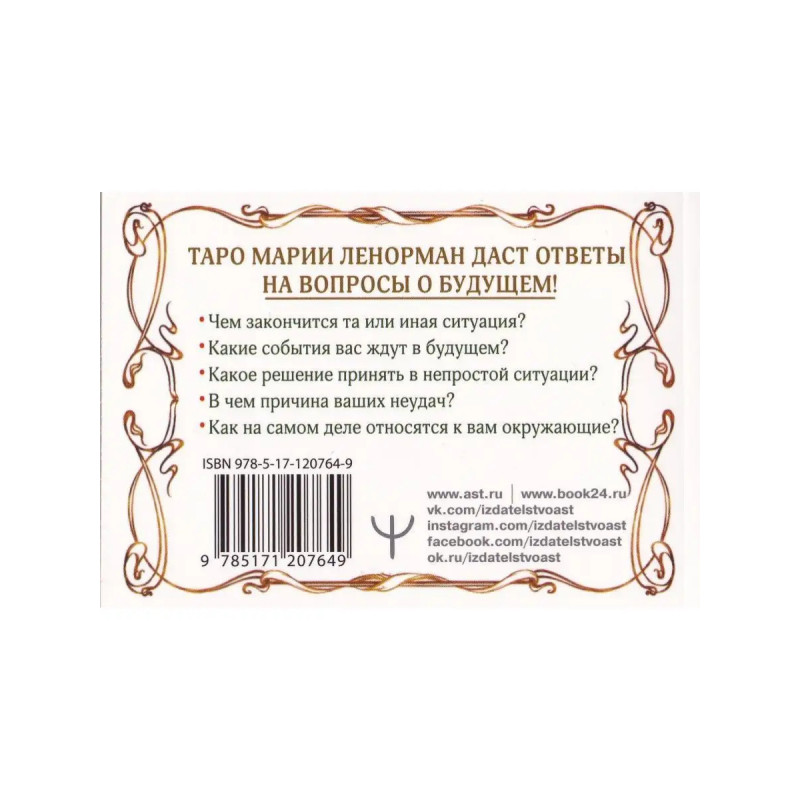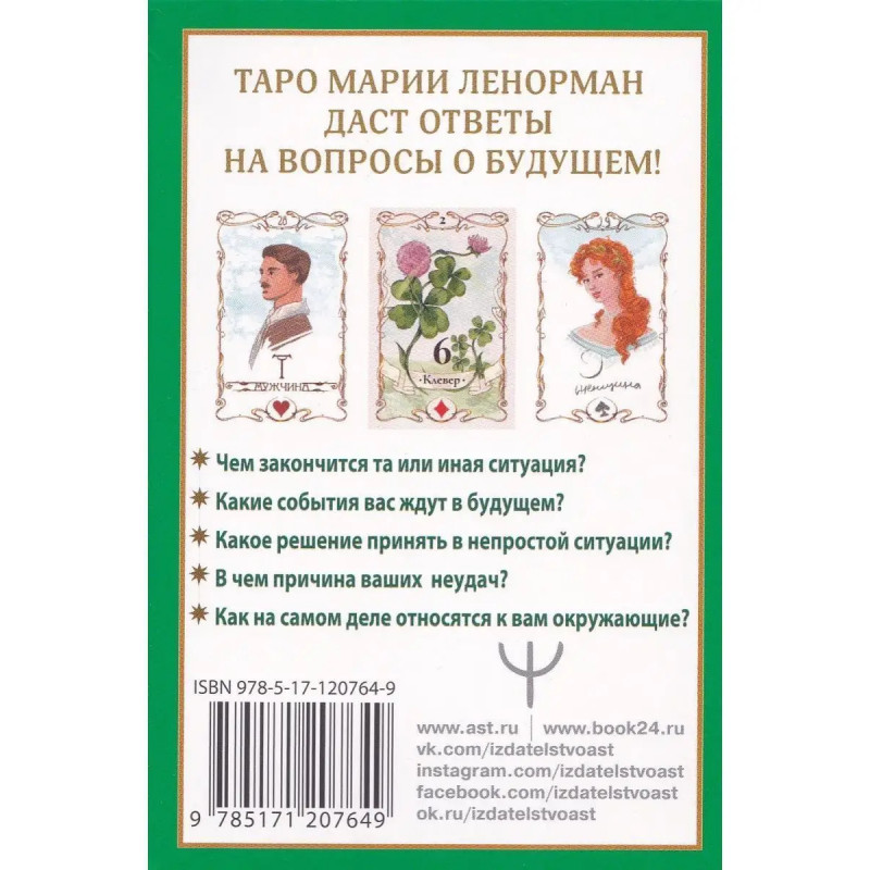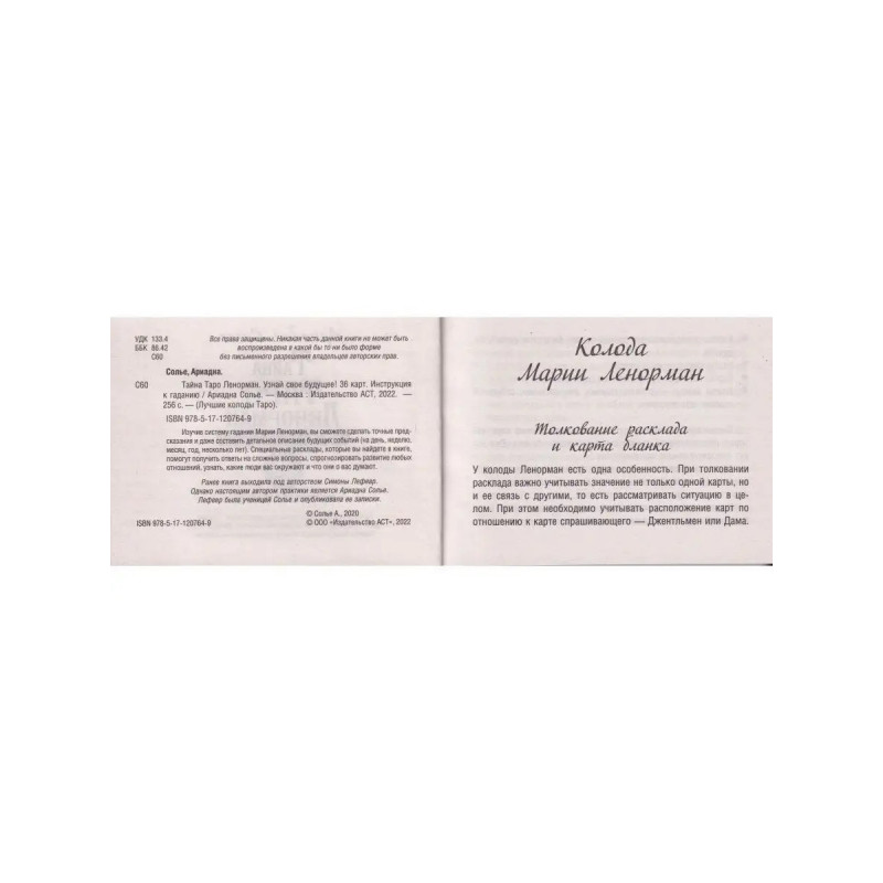 Тайна Таро Ленорман. Узнай свое будущее! 36 карт. Инструкция к гаданию. Солье Ариадна. ISBN 9785-17120-7649. Тайна Таро Ленорман. Узнай свое будущее! 36 карт. Инструкция к гаданию. Она предсказала судьбу Марии-Антуанетте и свадьбу с коронованной особой Жозефине Богарне, будущей жене Наполеона, к ее советам с вниманием прислушивался русский император Александр I. Эта великая женщина создала свою систему гадания и свою предсказательную колоду, которая стала одной из самых востребованных в мире. Изучив систему гадания Марии Ленорман, вы сможете сделать точные предсказания и даже составить детальное описание будущих событий (на день, неделю, месяц, год, несколько лет). Специальные расклады, которые вы найдете в книге, помогут получить ответы на сложные вопросы, спрогнозировать развитие любых отношений, узнать, какие люди вас окружают и что они о вас думают. В книге вы также найдете карты, которые можно вырезать и использовать для гадания. Размер карт: 120х80 мм. Сделано в России.