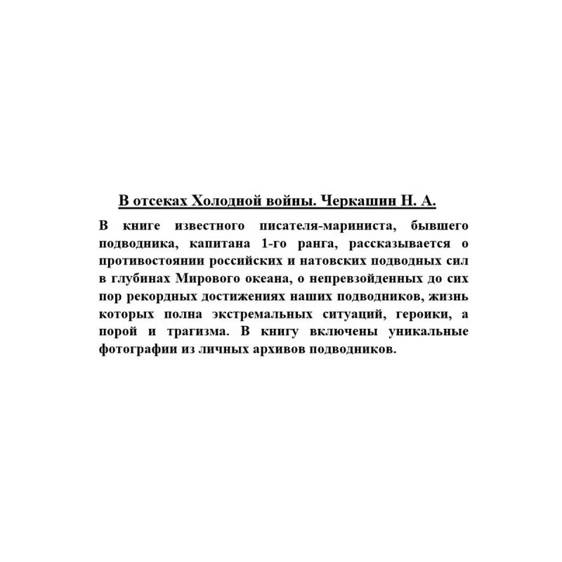 В отсеках Холодной войны. Черкашин Н. А. В книге известного писателя-мариниста, бывшего подводника, капитана 1-го ранга, рассказывается о противостоянии российских и натовских подводных сил в глубинах Мирового океана, о непревзойденных до сих пор рекордных достижениях наших подводников, жизнь которых полна экстремальных ситуаций, героики, а порой и трагизма. В книгу включены уникальные фотографии из личных архивов подводников.