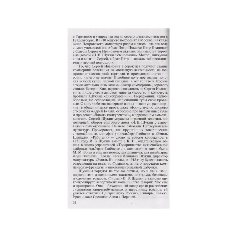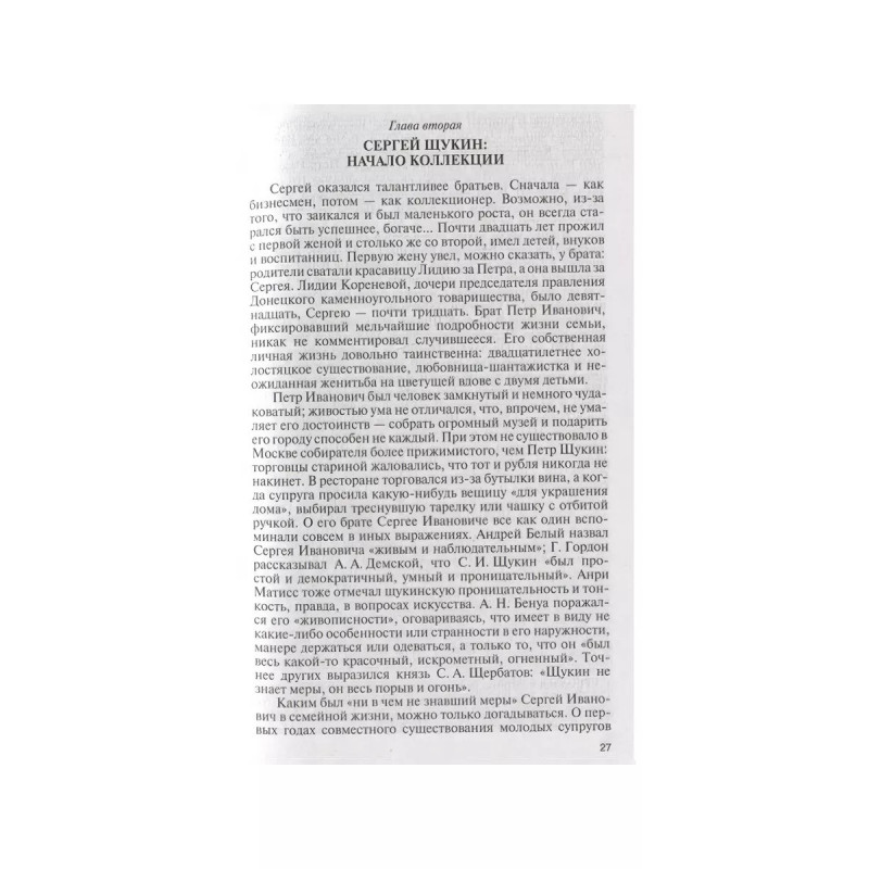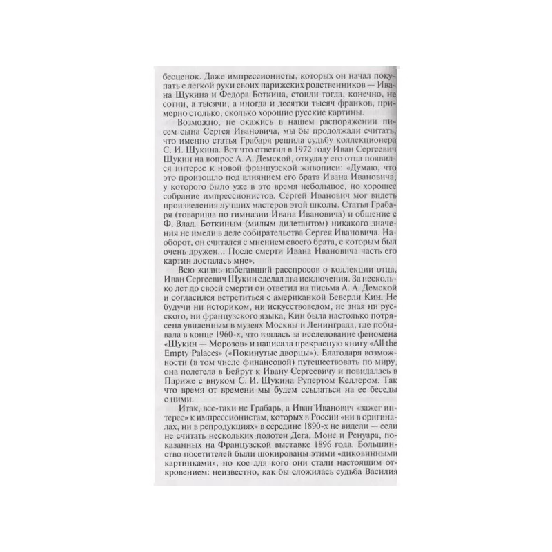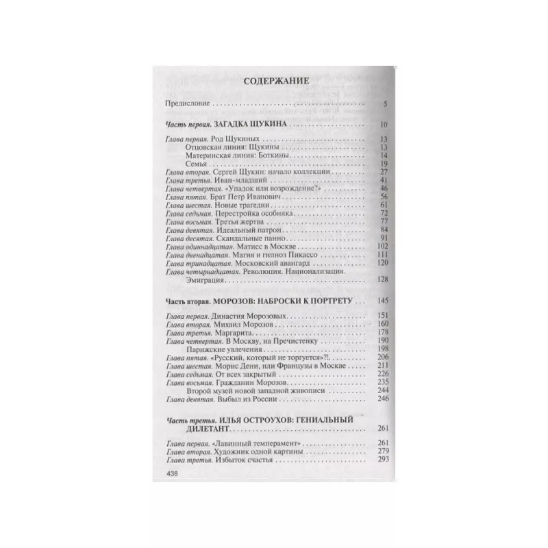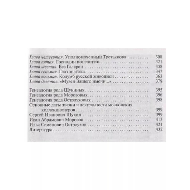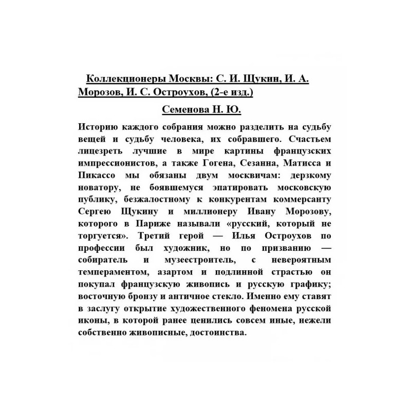 Коллекционеры Москвы: С. И. Щукин, И. А. Морозов, И. С. Остроухов, (2-е изд.). Историю каждого собрания можно разделить на судьбу вещей и судьбу человека, их собравшего. Счастьем лицезреть лучшие в мире картины французских импрессионистов, а также Гогена, Сезанна, Матисса и Пикассо мы обязаны двум москвичам: дерзкому новатору, не боявшемуся эпатировать московскую публику, безжалостному к конкурентам коммерсанту Сергею Щукину и миллионеру Ивану Морозову, которого в Париже называли русский, который не торгуется. Третий герой Илья Остроухов по профессии был художник, но по призванию собиратель и музеестроитель, с невероятным темпераментом, азартом и подлинной страстью он покупал французскую живопись и русскую графику; восточную бронзу и античное стекло. Именно ему ставят в заслугу открытие художественного феномена русской иконы, в которой ранее ценились совсем иные, нежели собственно живописные, достоинства.
