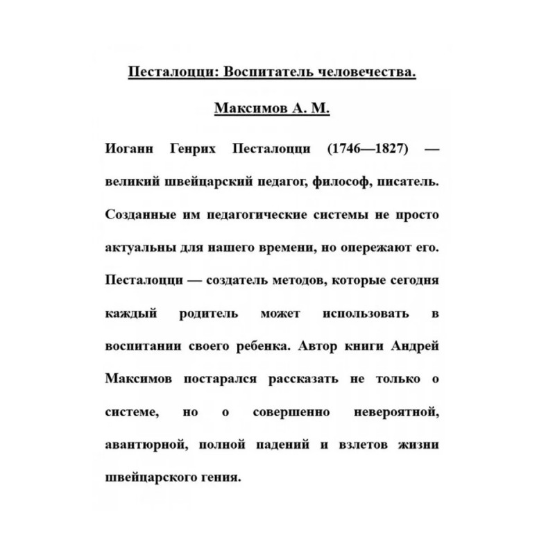 Песталоцци: Воспитатель человечества. Максимов А. М. Иоганн Генрих Песталоцци (17461827) великий швейцарский педагог, философ, писатель. Созданные им педагогические системы не просто актуальны для нашего времени, но опережают его. Песталоцци создатель методов, которые сегодня каждый родитель может использовать в воспитании своего ребенка. Автор книги Андрей Максимов постарался рассказать не только о системе, но о совершенно невероятной, авантюрной, полной падений и взлетов жизни швейцарского гения.