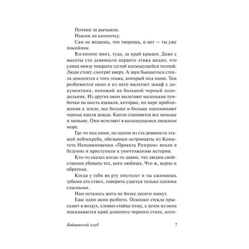 "Бойцовский клуб" самый знаменитый роман Чака Паланика. Все помнят фильм режиссера Дэвида Финчера с Брэдом Питтом в главной роли? Он именно по этой книге. Это роман-вызов, роман, созданный всем назло и вопреки всему, в нем описывается поколение озлобившихся людей, потерявших представление о том, что можно и чего нельзя, где добро и зло, кто они сами и кто их окружает. Сам Паланик называет свой "Бойцовский клуб" новым "Великим Гэтсби". Какие же они эти Гэтсби конца XX века?