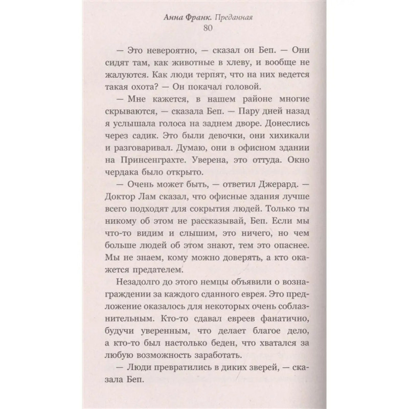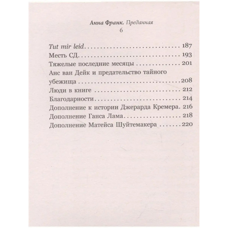 ISBN 9785171359881. Спустя 75 лет после смерти Анны Франк, Джерард Кремер сын члена Сопротивления в годы Второй мировой войны расследует дело о предательстве семьи Франк, основываясь на воспоминаниях своего отца и других свидетелей. По свидетельствам Кремера, семья Франк была предана Анс Ван Дейк еврейкой, выдававшей других евреев нацистам. Она стала единственной женщиной в Нидерландах, которой был вынесен смертный приговор за сотрудничество с нацистами. Хоть ее вина в деле о предательстве семьи Франк в то время окончательно так и не была доказана, эта книга обнаруживает множество ранее неизвестных фактов, которые могут стать ключом к раскрытию этой запутанной и страшной истории.