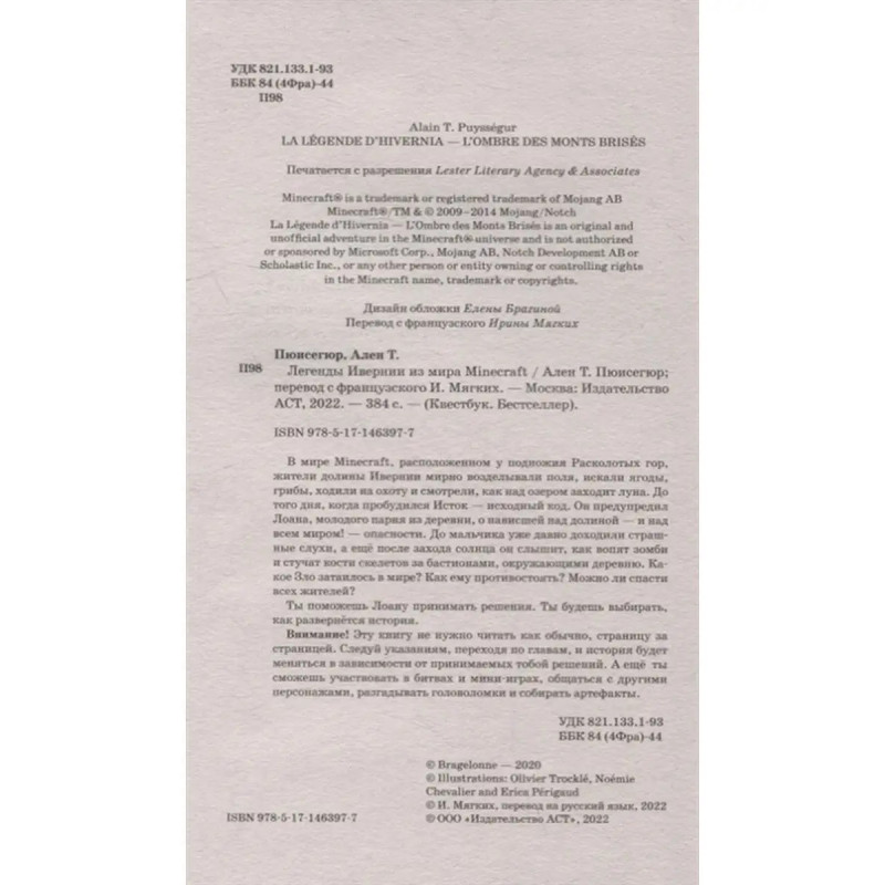 ISBN 9785171463977. В мире Minecraft, расположенном у подножия Расколотых гор, жители долины Ивернии мирно возделывали поля, искали ягоды, грибы, ходили на охоту и смотрели, как над озером заходит луна. До того дня, когда пробудился Исток - исходный код. Он предупредил Лоана, молодого парня из деревни, о нависшей над долиной - и над всем миром! - опасности. До мальчика уже давно доходили страшные слухи, а ещё после захода солнца он слышит, как вопят зомби и стучат кости скелетов за бастионами, окружающими деревню. Какое Зло затаилось в мире? Как ему противостоять? Можно ли спасти всех жителей?