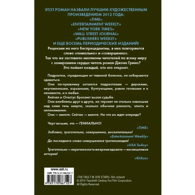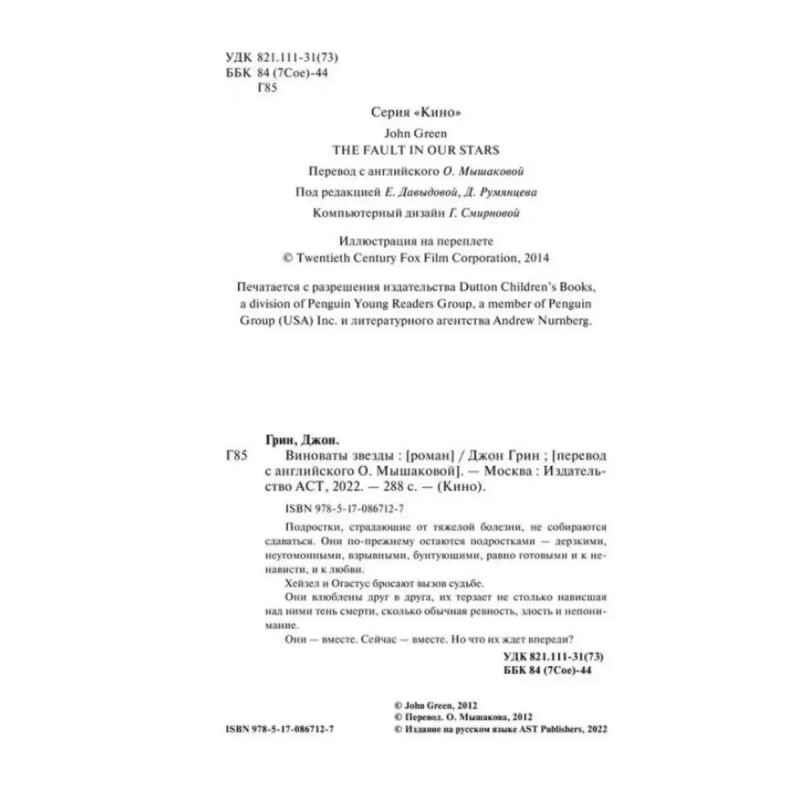 ISBN 9785-1708-67127. Виноваты звезды. Они по-прежнему остаются подростками ядовитыми, неугомонными, взрывными, бунтующими, равно готовыми и к ненависти, и к любви. Хейзел и Огастус бросают вызов судьбе. Они влюблены друг в друга, их терзает не столько нависшая над ними тень смерти, сколько обычная ревность, злость и непонимание. Они вместе. Сейчас вместе.
